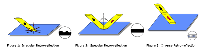 Light retro-reflection can be divided into irregular retro-reflection, specular retro-reflection and inverse retro-reflection, see Figure 1 to 3.