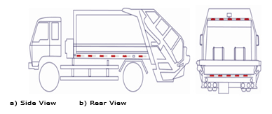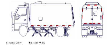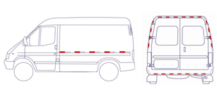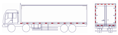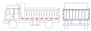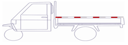 For three-wheeled vehicles, the length of retro-reflective markings of vehicle body sides should not be less than 1.2m. If the carriage length is less than 50% of total length of cargo truck, the carriage length should be deemed as the length of retro-reflective markings. In event that the side structure of the vehicle body doesn’t have continuous surface, such as cement mixers, special operations vehicles, the total pasting length should not be less than 30% of total vehicle length. The retro-reflective markings on the sides of the vans and van trailers should be able to reflect the outline of the carriage.