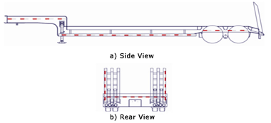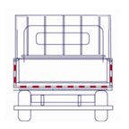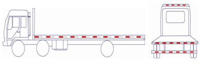 Note: The retro-reflective markings should be pasted to lateral side of the truck along the smooth & continuous surface and the intermittent paste is applicable. Due to different truck structures the pasted retro-reflective markings may not be in the same horizontal plane. The Class Two retro-reflective markings should be pasted to the rear part of the flatbed and lower part of the rear of the flatbed semi-trailer continuously. If Class One retro-reflective markings are used, the intermittent paste is applicable, but each continuous segment length should not be less than 300mm and at least include one white retro-reflective markings unit and one red retro-reflective markings unit. The total pasted areas should not be less than 0.1m 2.As the flatbed semi-trailer has a ladder in the rear part, the retro-reflective markings should be pasted to the outmost ladder frame, at least to the top part, medium part and lowest part of the ladder. Each continuous segment length should not be less than 300mm and including one red retro-reflective markings unit and one white retro-reflective markings unit.