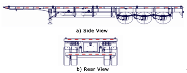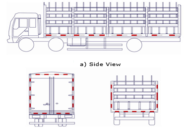 Note: for lateral side of flatbed truck, the retro-reflective markings should be pasted to the continuous surface of bottom edge horizontally. Figure b) is a typical pasting example for Class Two retro-reflective markings. If the retro-reflective markings can not be pasted to the bottom flatbed, two rows of retro-reflective markings should be affixed to the protective equipments in parallel and pasting areas should not be less than 0.2m2. When the Class One retro-reflective marking materials are used for the rear part of the flat truck, you can paste the retro-reflective markings materials continuously on lower or back protective equipments and pasting areas should not be less than 0.1m2.