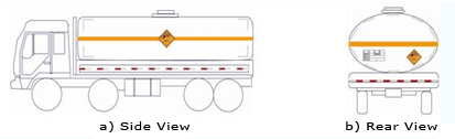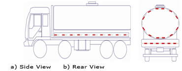 Note: for tank truck and tank semi-trailer, the retro-reflective markings should be pasted to the lateral truck frame or the middle part of tank horizontally to reflect the length of the tank. For the irregular tank semi-trailer, the retro-reflective markings should be pasted to the middle part of the side face to reflect the length of the tank. In the rear part of the tank truck, retro-reflective markings are used to draw the outline of the tank. The quantity actually used of Class Two Reflective materials should twice as many as the Class One retro-reflective markings materials
