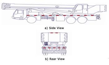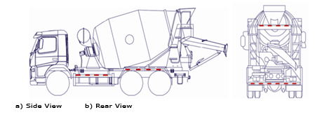 Note: The retro-reflective markings for side faces of the cement mixer should be pasted continuously on any possible places (e.g. lateral protective equipments) and the total length of pasted retro-reflective markings can be less than 50% of the total length of the vehicle, but the total length of pasted retro-reflective markings should not be less than 30% of the whole length of the vehicle and the intervals shall not be unrestricted. For the rear part of the cement mixer, the retro-reflective markings should be pasted to any continuous surface which can reflect the width and height of the vehicle rear part, such as Lower guards, metal fenders and other fixed structural parts.