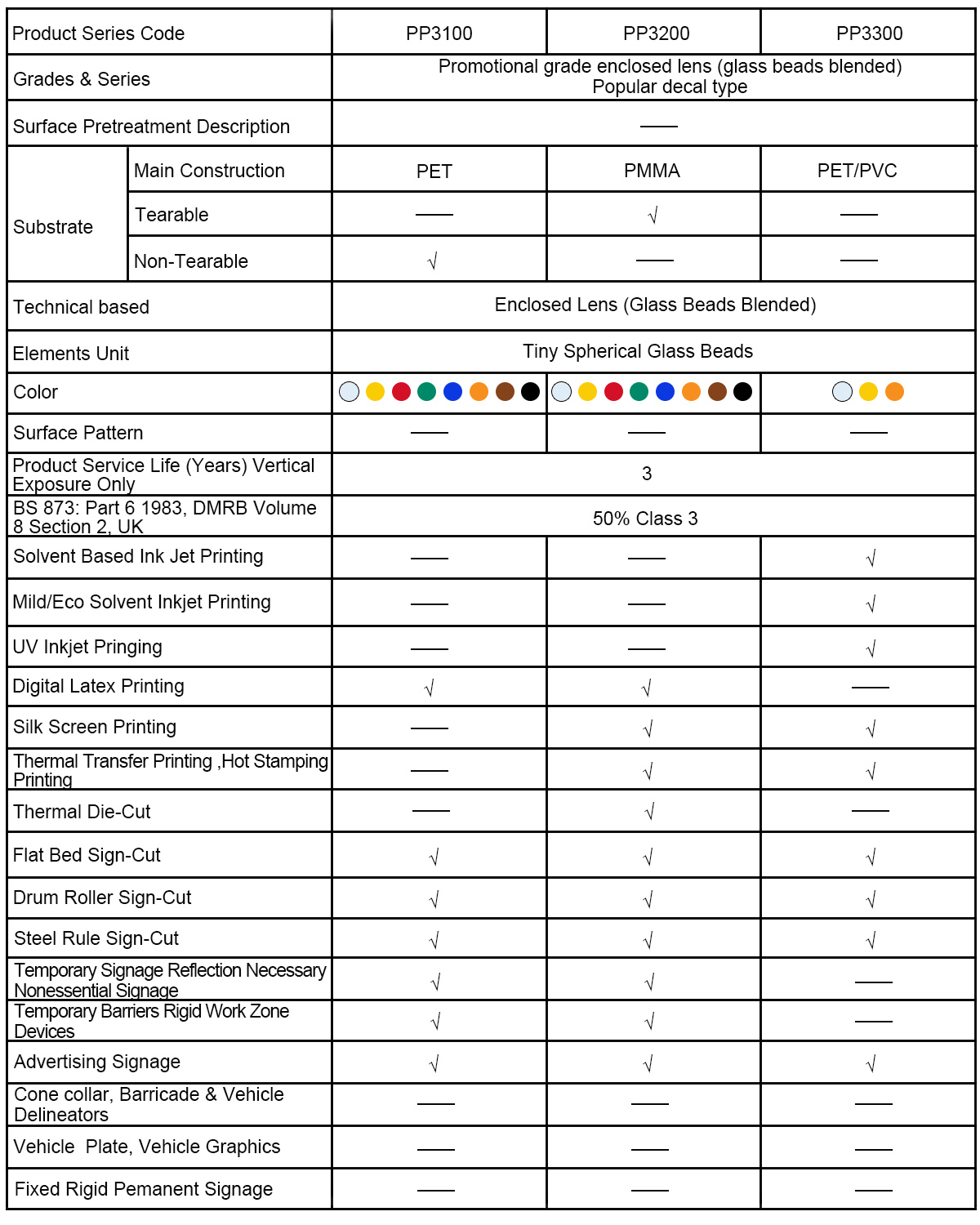 The PP3000 reflective sheeting is available in normal eight colors and special seventeen colors, with a choice of three substrates: PET, Acrylic and PVC. The PSA glue with two kinds available: transparent, white. The standard available width sizes are 0.61m, 0.62m, 0.91m, 1.22m, 1.24m. It is easy to be cutting with computerized plotter and printing with digital printers. It is suitable for applying to the pre-cleaned steel, aluminum and plastic boards (Plastic Boards should be tested for suitability before use).