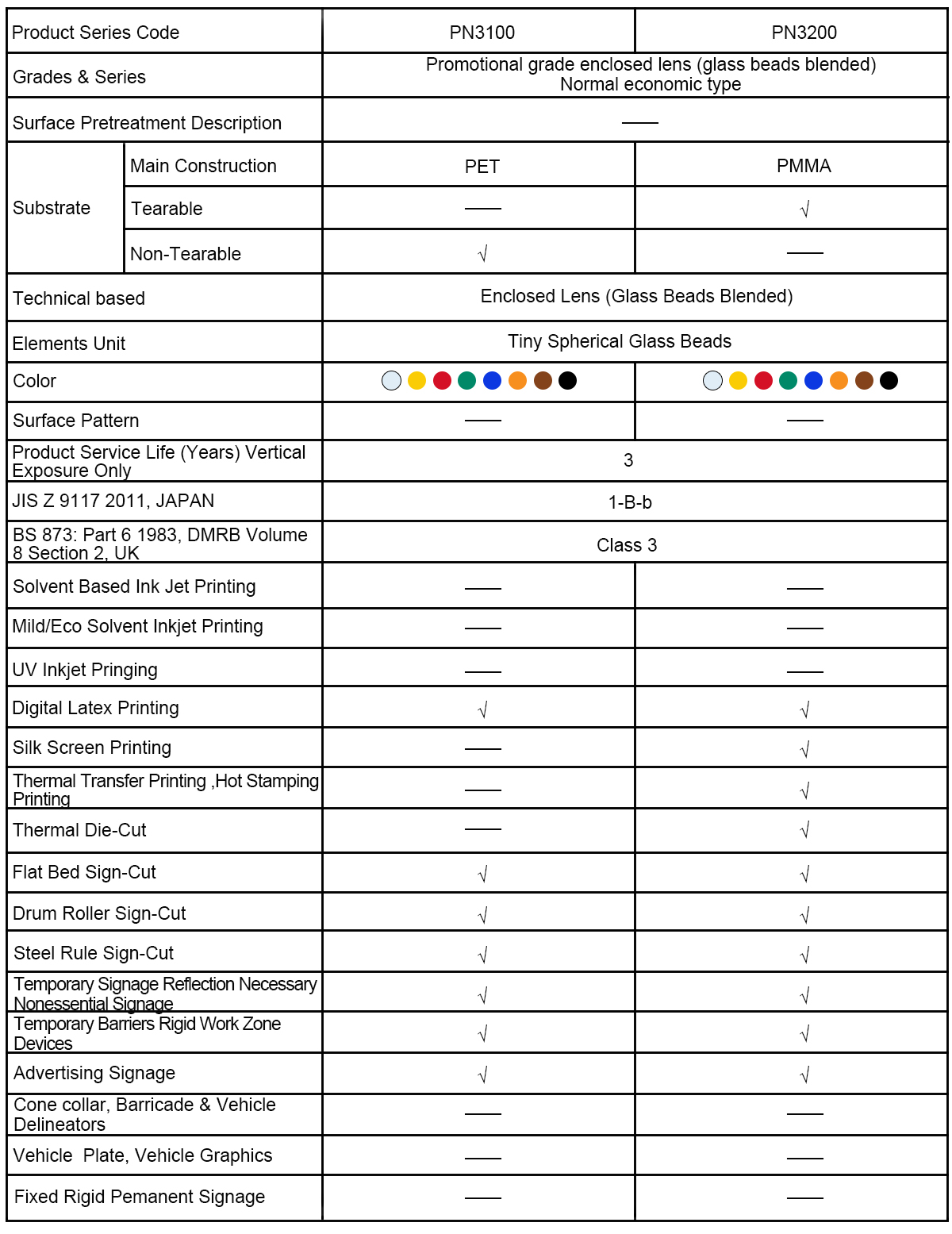 The PN3000 reflective sheeting is available in normal eight colors and special seventeen colors, with a choice of twosubstrates: PET, Acrylic. The PSA glue with two kinds available: transparent, white. The standard available width sizes are 0.61m, 0.62m, 0.91m, 1.22m, 1.24m. It is easy to be cutting with computerized plotter and printing with digital printers. It is suitable for applying to the pre-cleaned steel, aluminum and plastic boards (Plastic Boards should be tested for suitability before use).