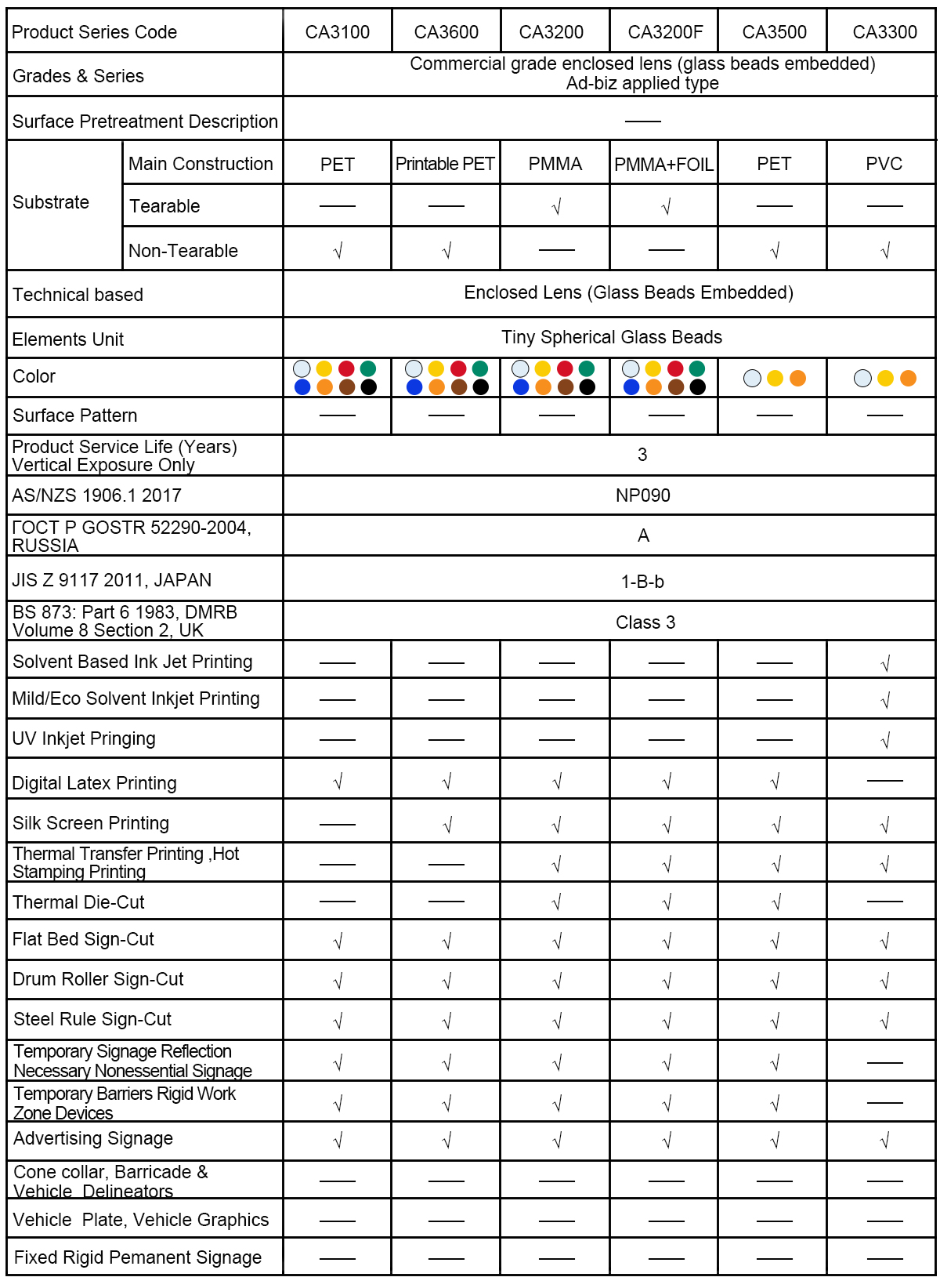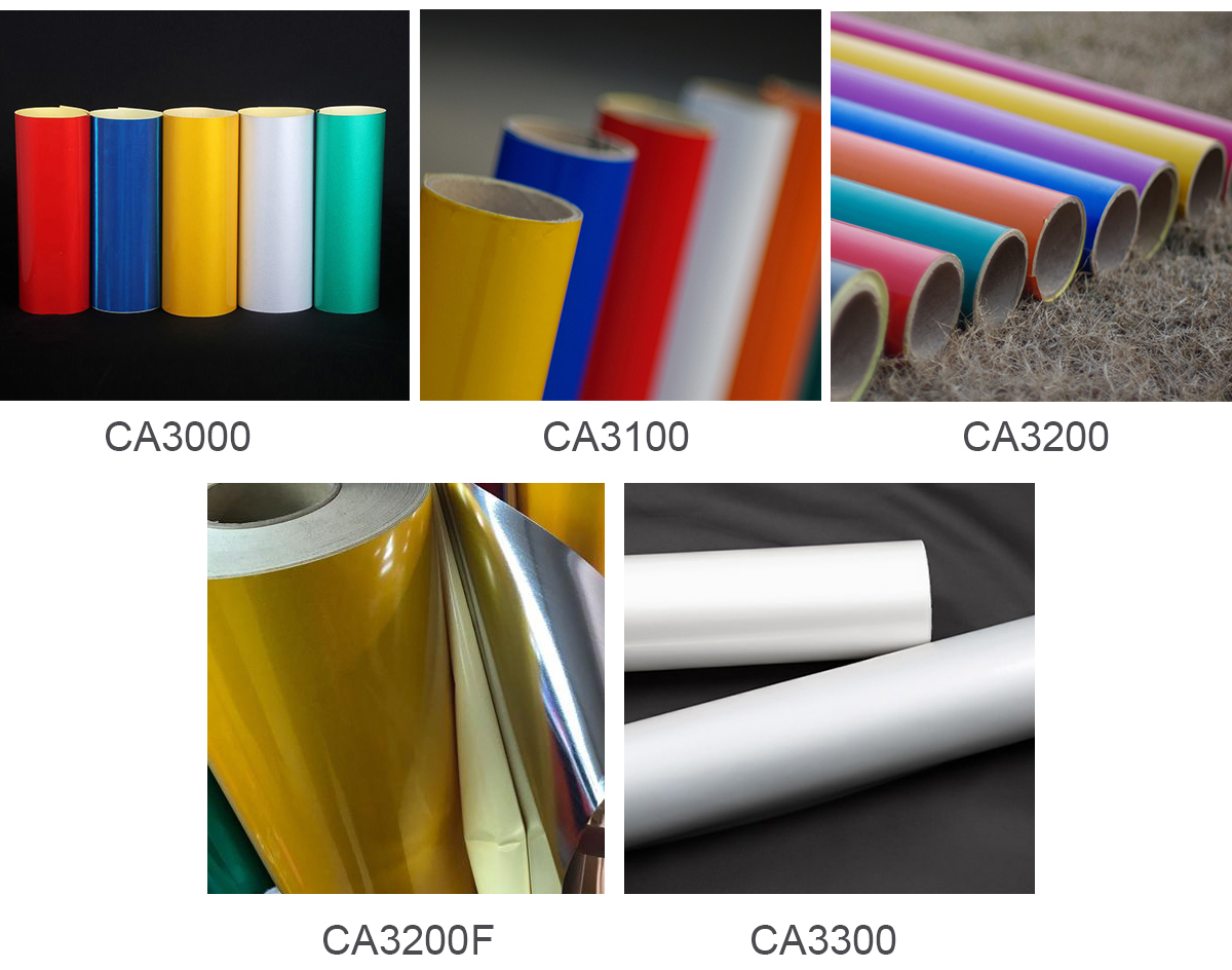 The CA3000 reflective sheeting is available in normal eight colors and special seventeen colors, with a choice of three substrates: PET, Acrylic, PVC, AL foil. The PSA glue with two kinds available: transparent, white. The standard available width sizes are 0.61m, 0.62m, 0.91m, 1.22m, 1.24m. It is easy to be cutting with computerized plotter and printing with digital printers. It is suitable for applying to the pre-cleaned steel, aluminum and plastic boards (Plastic Boards should be tested for suitability before use).