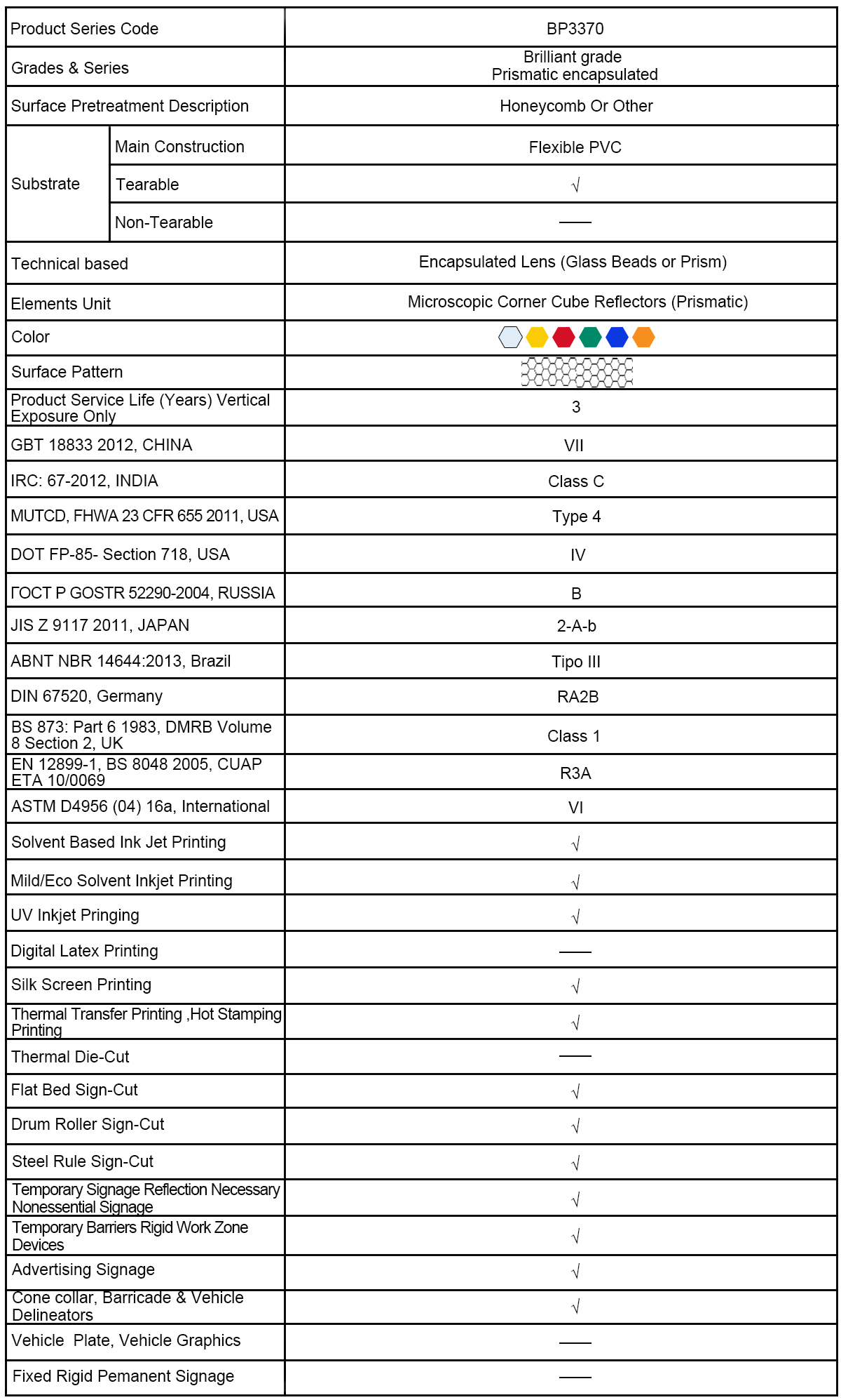 They are ideal for non-specification signage requirements widely used as construction and temporary traffic signagesuch as off-road signage, barricade warning marking, cone collar and parking lots and ink-jet printing outdoor advertising applications as well. Welcome to find our BP3300 Reflective Sheeting. We supply the best qualified BP3370 Reflective Sheeting with consistent performance at a competitive price as always.