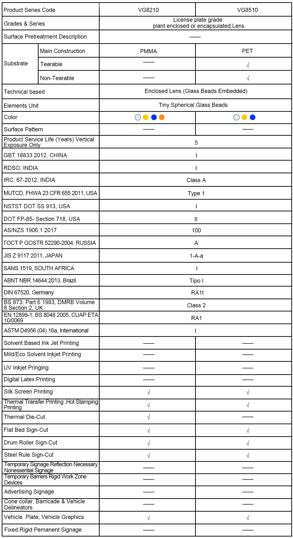 The VG8200 & VG8500 reflective sheeting is available in normal three colors, with a choice of two substrates: PET, Acrylic. The product is self-adhesive with PSA transparent and release liner. The standard available width sizes 0.61m, 0.62m, 1.22m, 1.24m. It is easy to be cutting with computerized plotter and thermal transfer printing. It is suitable for applying to aluminum boards for embossing different license plates. More details pls check the overview table or Spec sheet.