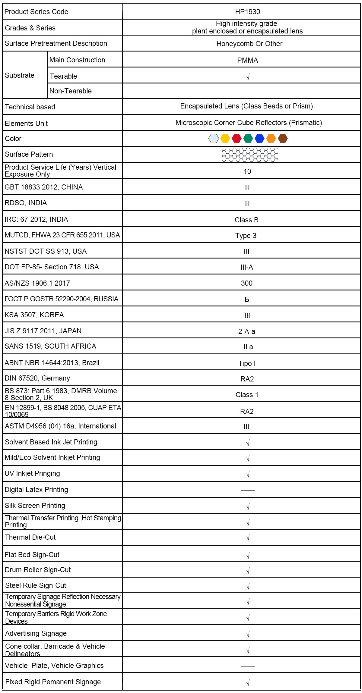 The HP1930 reflective sheeting is available in normal seven colors, with tearable Acrylic substrate and white PSA and release liner. The standard available width sizes 1.22m, 1.24m. It is easy to be cutting with computerized plotter and silk screen printing. It is suitable for applying to the pre-cleaned steel, aluminum and plastic boards (Plastic Boards should be tested for suitability before use).