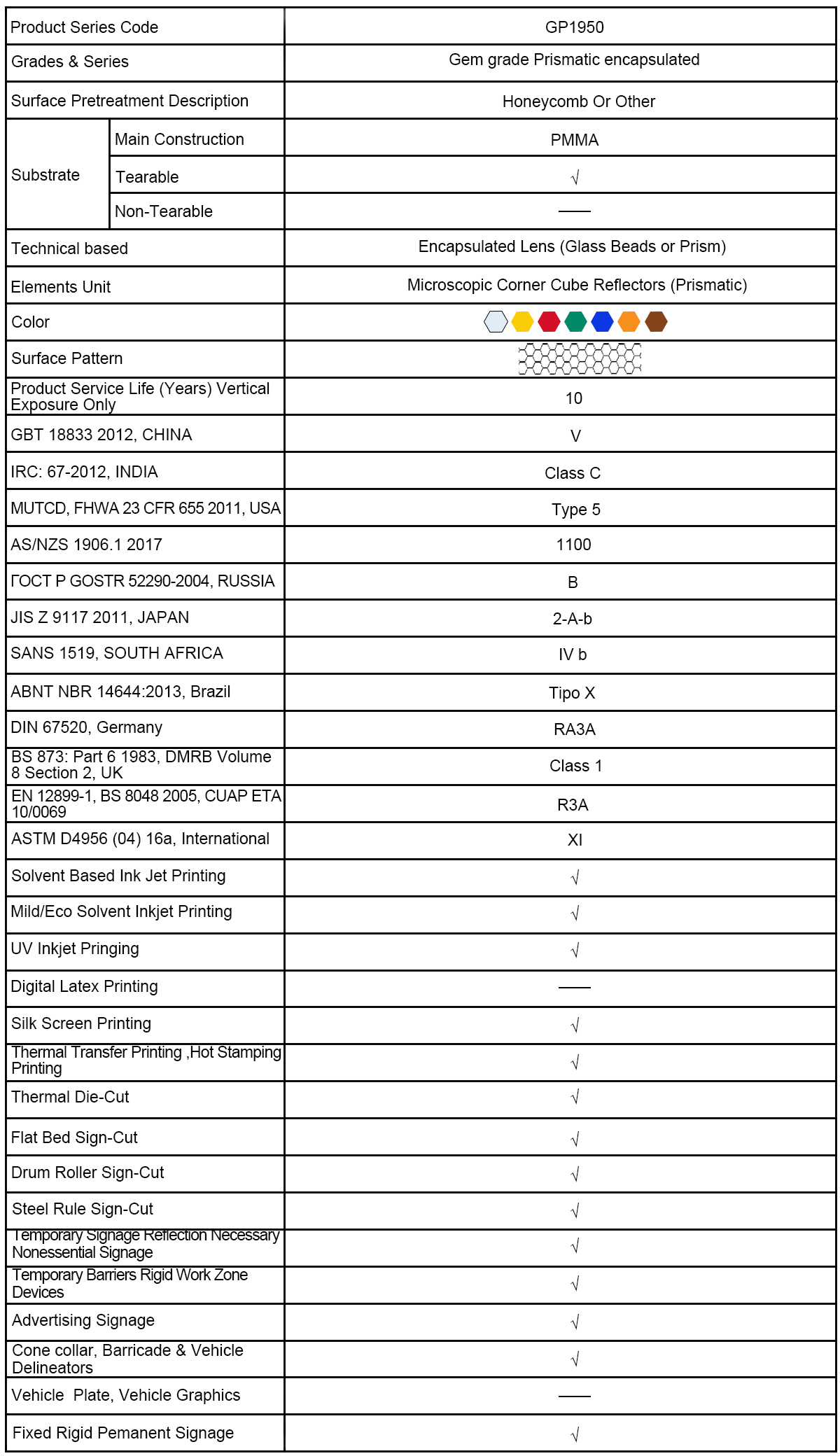 Aeon-LiteTM GP1950 Reflective Sheeting is produced according to the standards: ASTM D4956 Type VI and EN-12899 RA2. The products which are ideal for fixed permanent traffic signs, temporary traffic control devices, barricade, traffic cone collar, traffic calming schemes, construction site signs, delineator reflective tape, and other types of safety devices requiring high visibility, legibility and durability. Different surface film, different reflectivity and different service life provide you different choices. This cost-effective film performs well in many applications.
