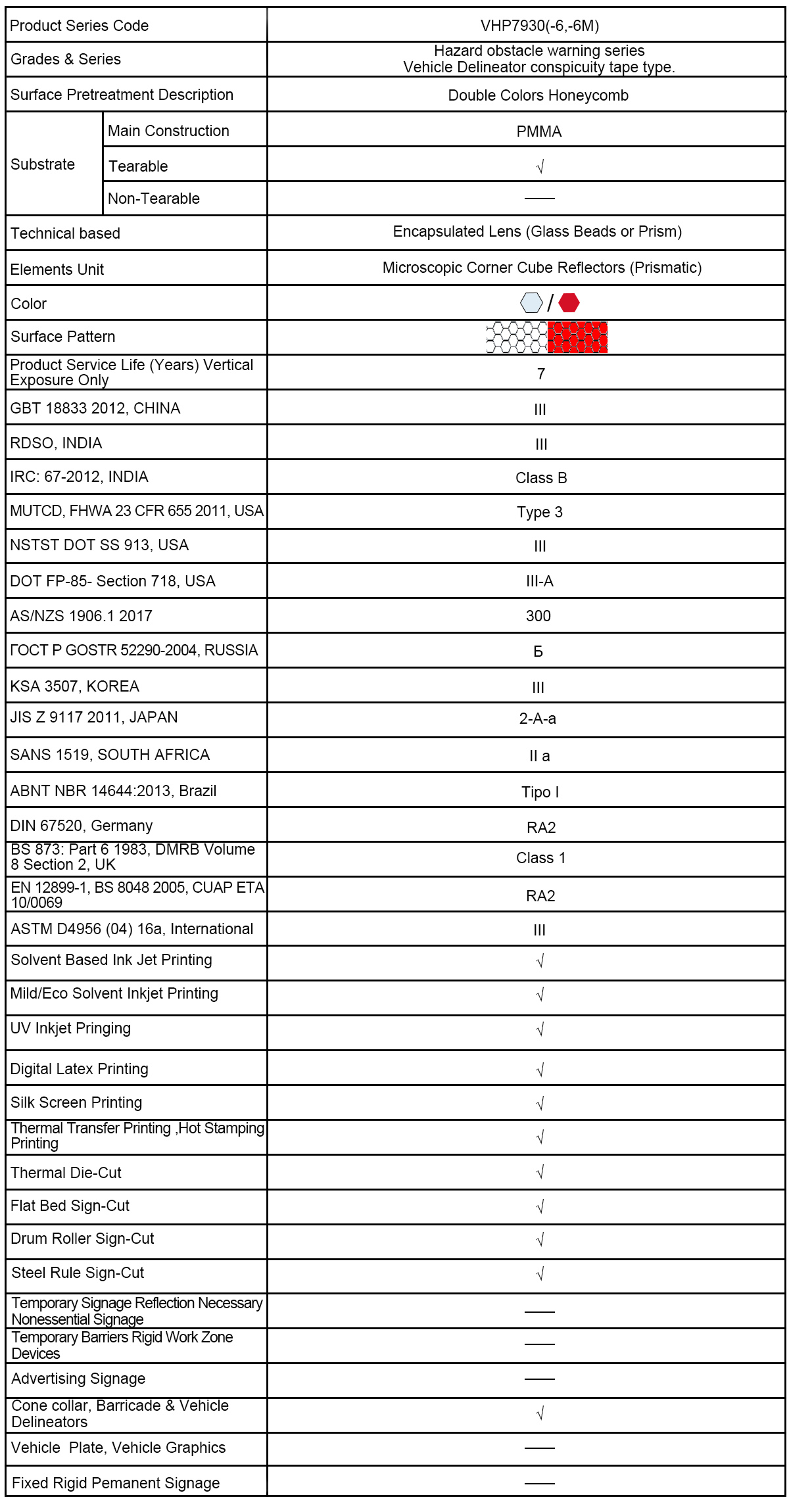 Aeon-LiteTM Vehicle delineator conspicuity Grade contour marking retro-reflective tape VHP7930(-6,6M) series are two kinds of 5 years durable product with encapsulated high reflecting index microscopic corner cube reflectors in a double color pre-coating layer, while it performs very well to return the incident lights overall.