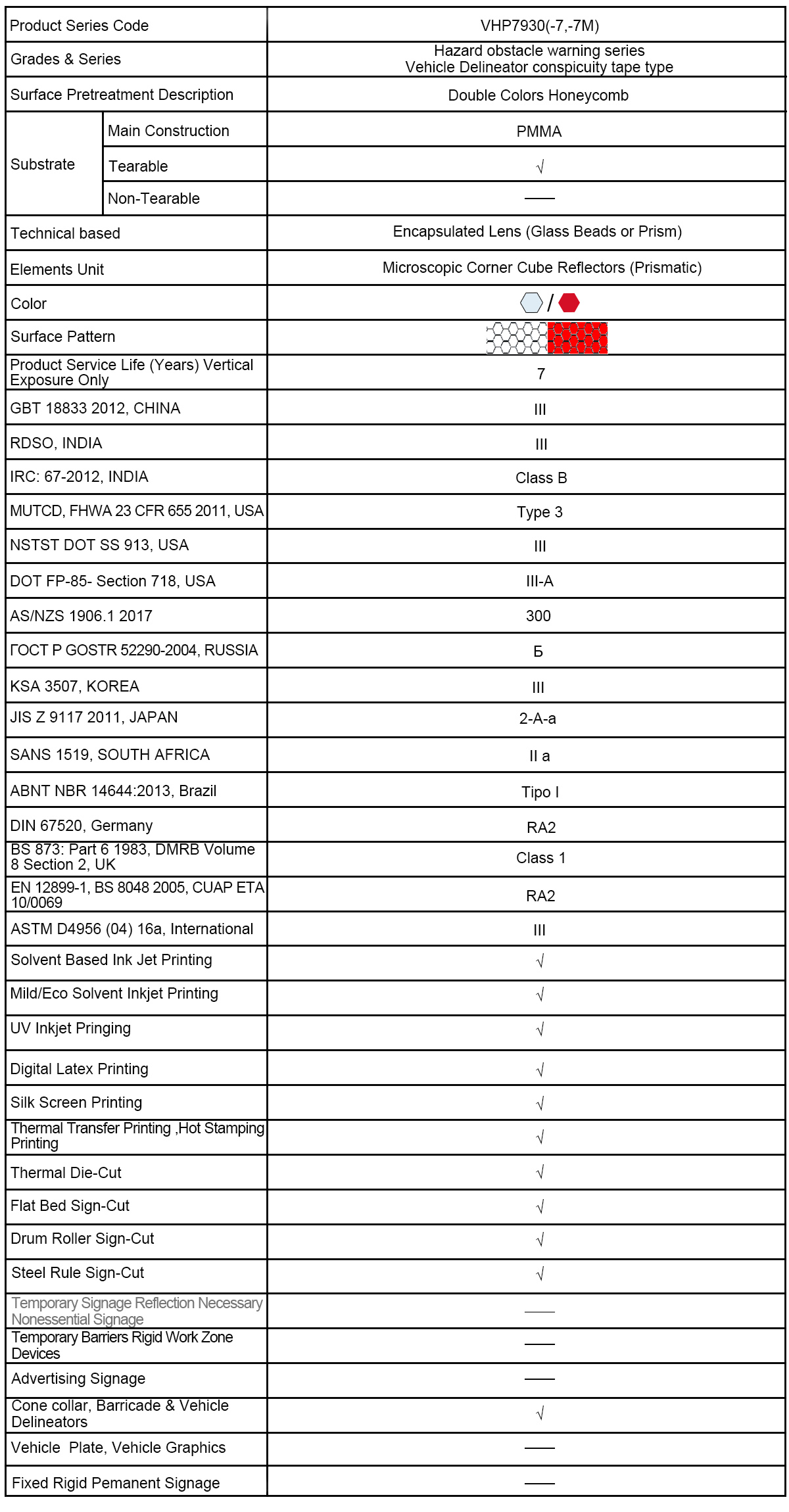The VHP7930(-7,7M) contour marking retro-reflective tape is available in only white/red, with tearable Acrylic substrates and PSA white glue and release liner. The standard available width sizes 5 cm. It is easy to be cutting for using on vehicle body. It is suitable for applying to the pre-cleaned steel, aluminum and plastic surface (Plastic Boards should be tested for suitability before use). More details pls check the overview table or Spec sheet.