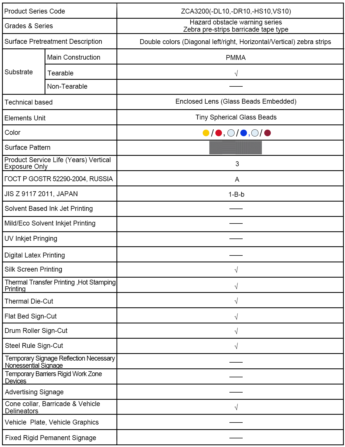 The series reflective sheeting is just customized of different patterns depend on client’s request. We can supply different strips in horizontal or vertical direction, also we can make diagonal strips in left or right directions with customized sizes. Different surface film, different direction of strips for this series provides you different choices (Like ZCA3200(-DL10, -DR10, -HS10, VS10) etc.). This cost-effective film performs well in many applications.