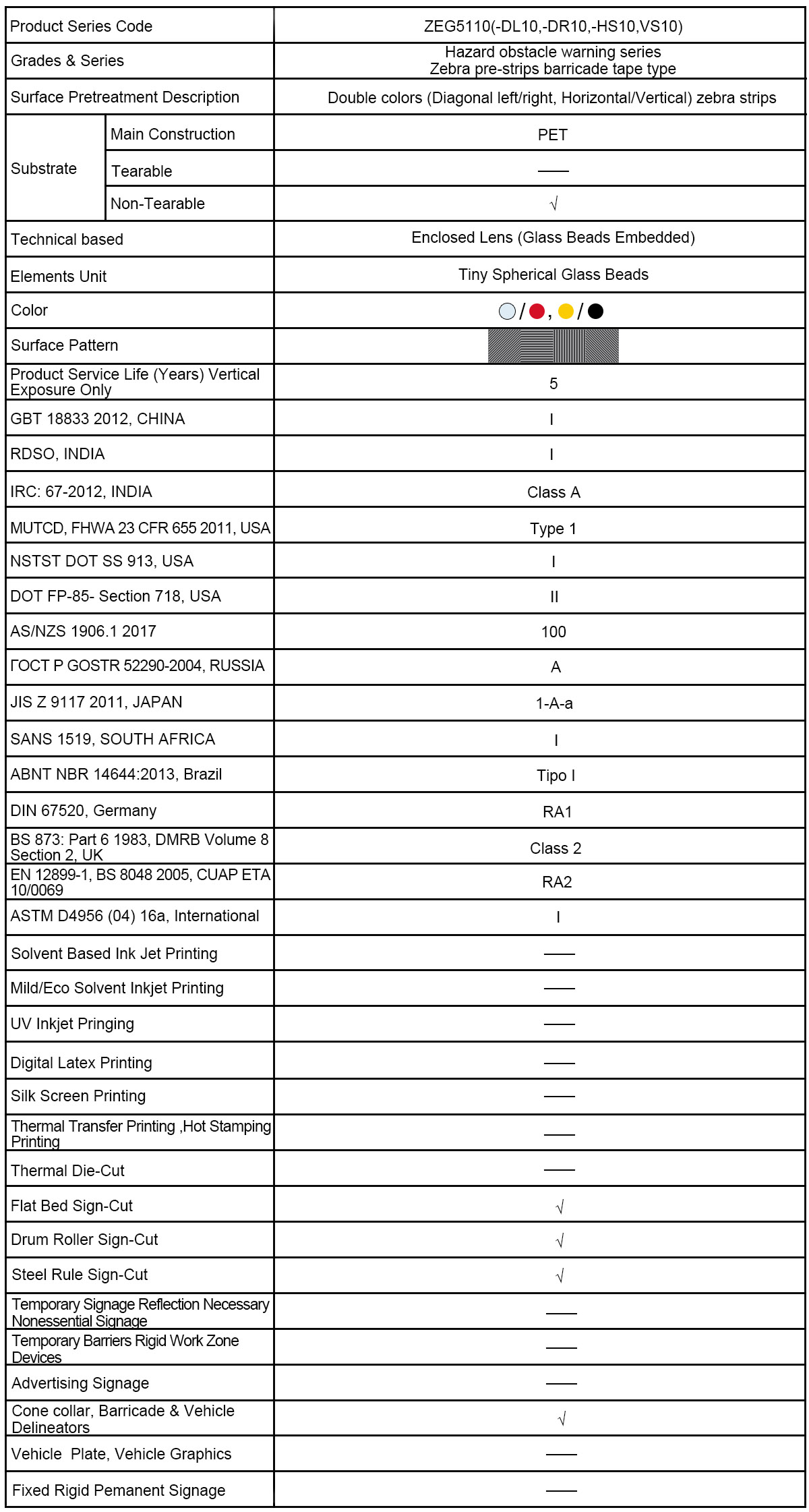 Aeon-LiteTM Hazard Obstacle Warning Series Zebra pre-strips barricade tape type ZEG5110 Series Reflective Sheeting could be different kinds of 5 years durable products with embedded high reflecting index micro spherical glass beads in a double color pre-coating layer, while it performs very well to return the incident lights overall.