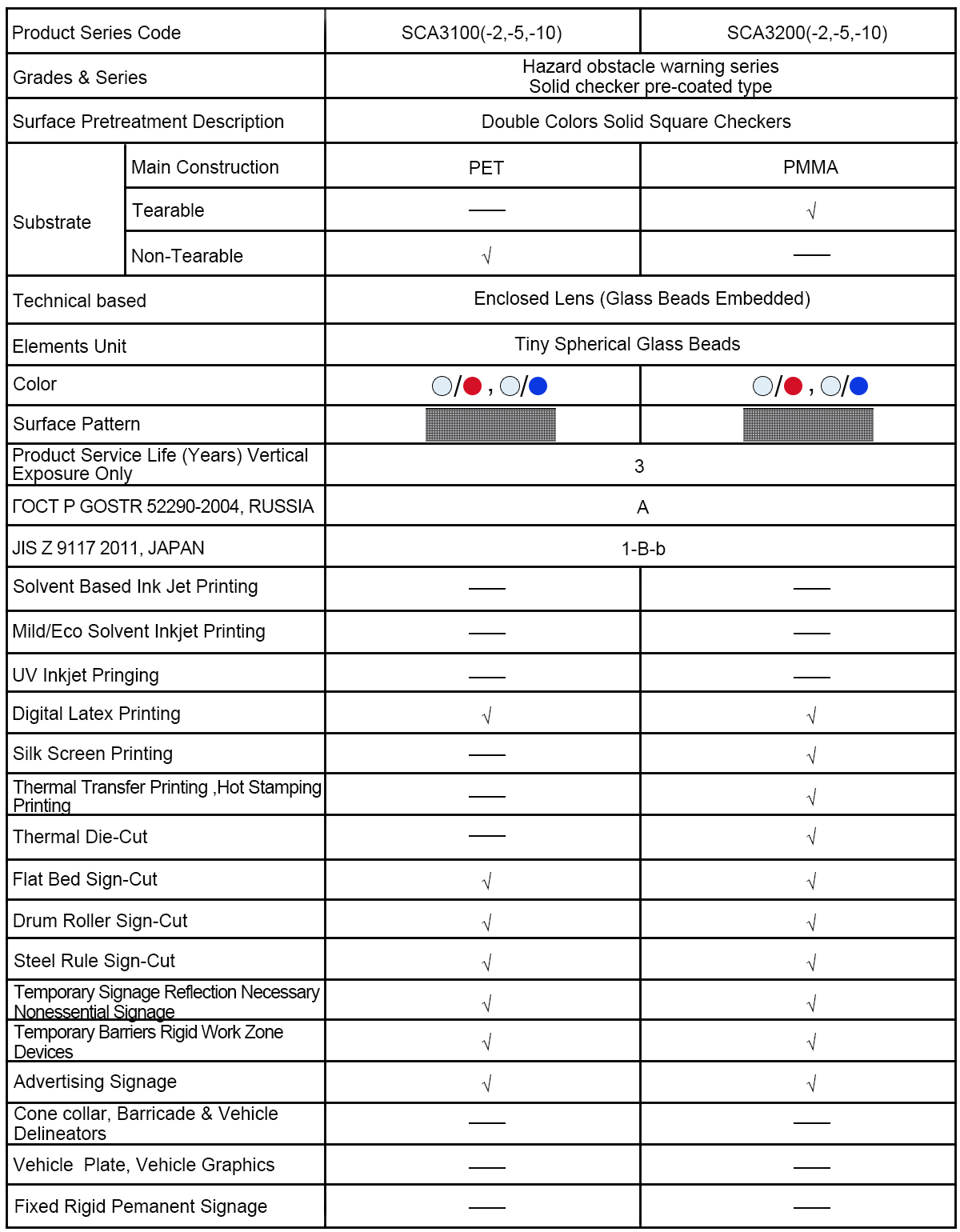 Aeon-LiteTM Hazard Obstacle Warning Series Solid Checker Pre-coated type SCA3100&SCA3200 Series Reflective Sheeting could be different kinds of 3 years durable products with embedded high reflecting index micro spherical glass beads in a double color pre-coating layer, while it performs very well to return the incident lights overall.