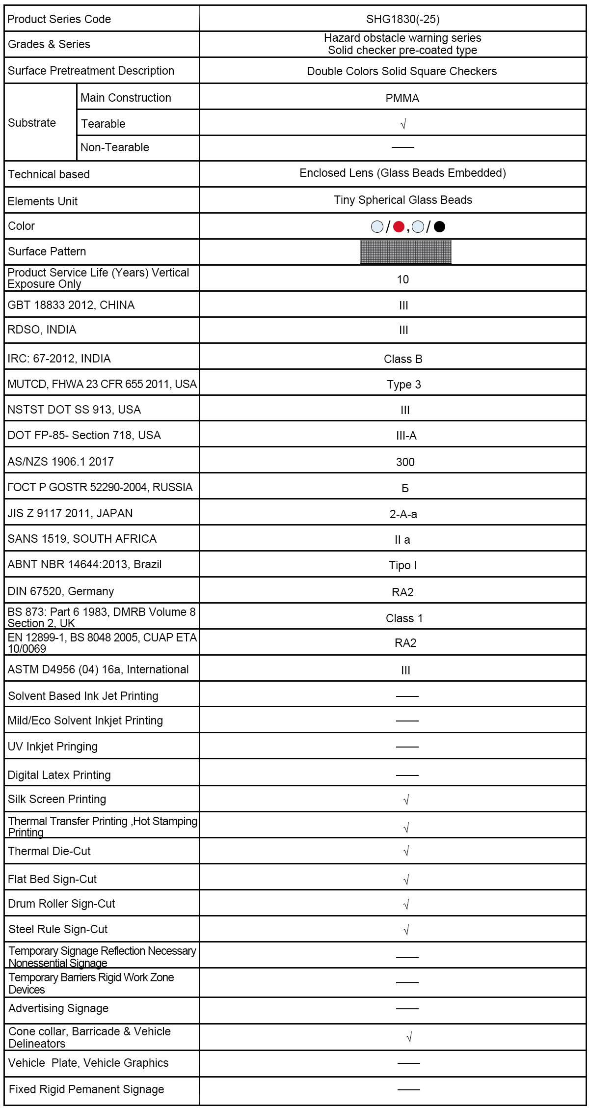 Aeon-LiteTM Hazard Obstacle Warning Series Solid Checker Pre-coated type SHG1830 Series Reflective Sheeting could be different kinds of 10 years durable products with embedded high reflecting index micro spherical glass beads in a double color pre-coating layer, while it performs very well to return the incident lights overall.