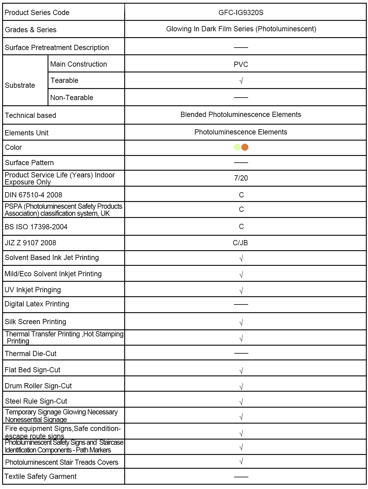 The GF-IG9320S glowing in dark series photoluminescent film is available in ivory, ivory green, with the substrate of PVC. We have different width sizes available. It is easy to be cutting with computerized plotter and printing. More details pls check the Spec sheet.