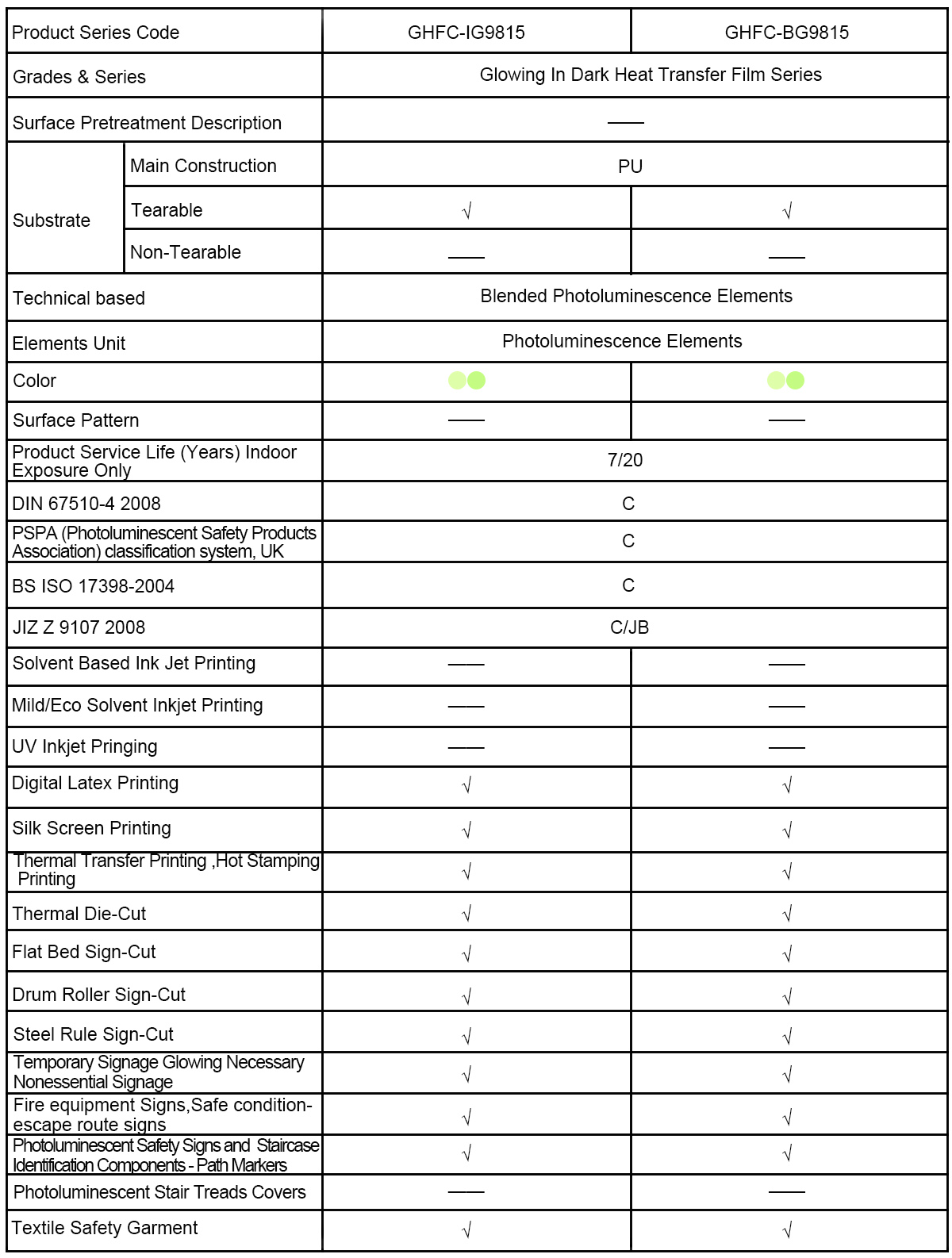 Aeon-LiteTM GHF-9800 series glowing in dark heat transfer film is kind of long durable film embedded with alkalineearth aluminates andsilicate which are activated by rare earth element (Photoluminescence (Phosphorescence) is the discharge of an electromagnetic radiation (Photons) of a material after being submitted to a luminous excitation.), with outdoor 7 years and indoor 20 years’ service life and perfect emit light ability, intended for production of alarm equipment, fire equipment, security equipment, etc. which has the purpose of effectively transmitting the message for which it was manufactured.