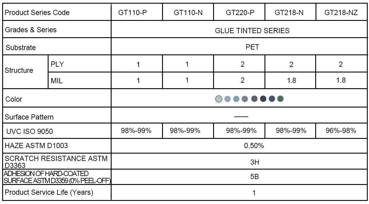 The GT series window film is available in many different colors: black, green, blue, grey, charcoal green etc., with the substrate of Tinted PET. We have different width sizes available: 1.52m*30m, 1.52m*60m, 1.52m*600m etc. It is easy to be cutting by knife and install to the windows. More details pls check the Spec sheet.