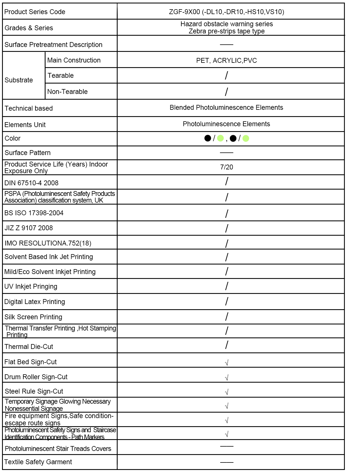 The ZGF-9X00 glowing in dark series photoluminescent film is available in ivory/black, orange/black etc, with the substrate of PET, Acrylic or PET. We have different width sizes available. It is easy to be cutting with computerized plotter and printing. More details pls check the Spec sheet.