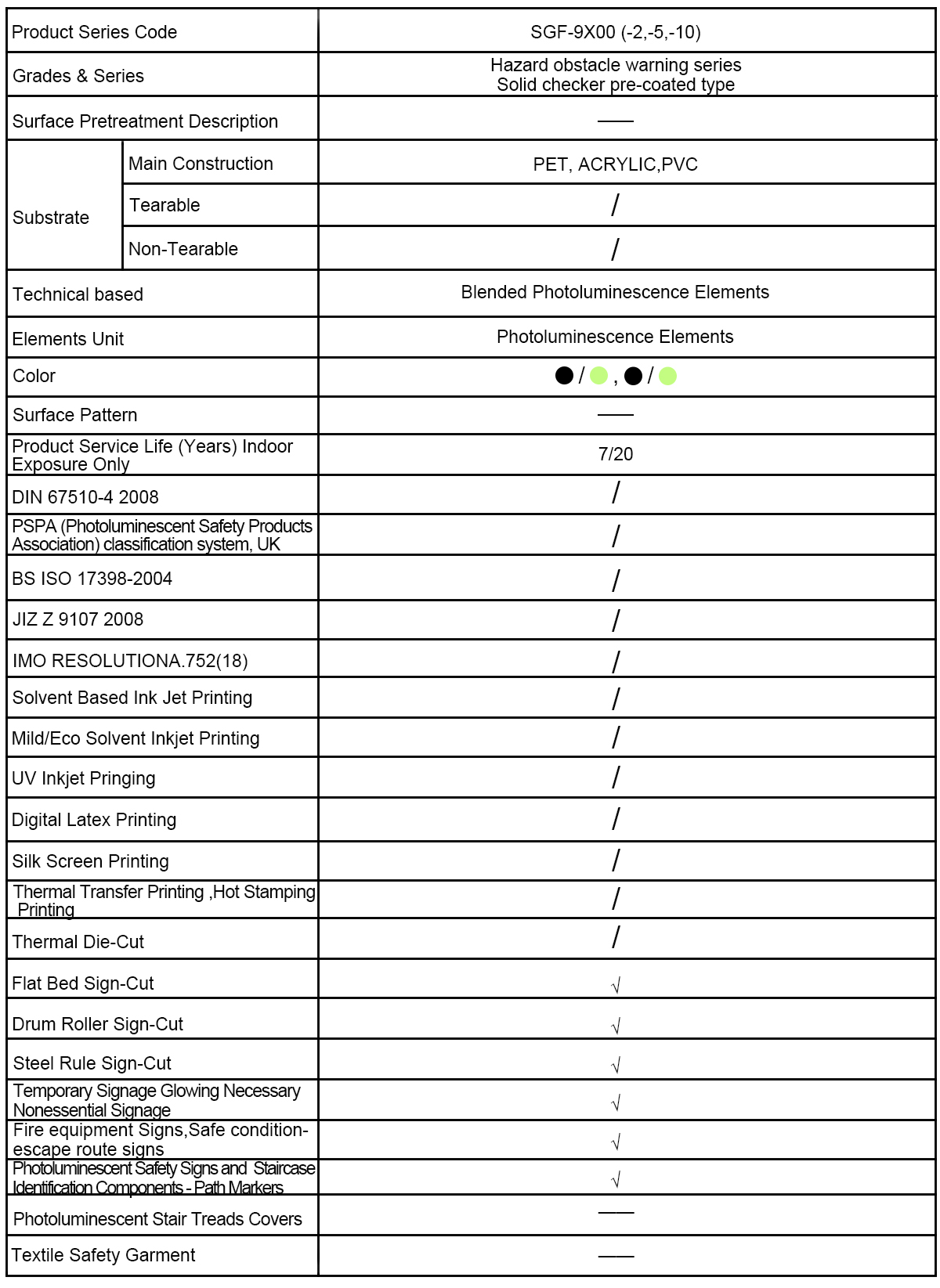 The SGF-9X00 glowing in dark series photoluminescent film is available in ivory/black, orange/black etc, with the substrate of PET, Acrylic or PET. We have different width sizes available. It is easy to be cutting with computerized plotter and printing. More details pls check the Spec sheet.