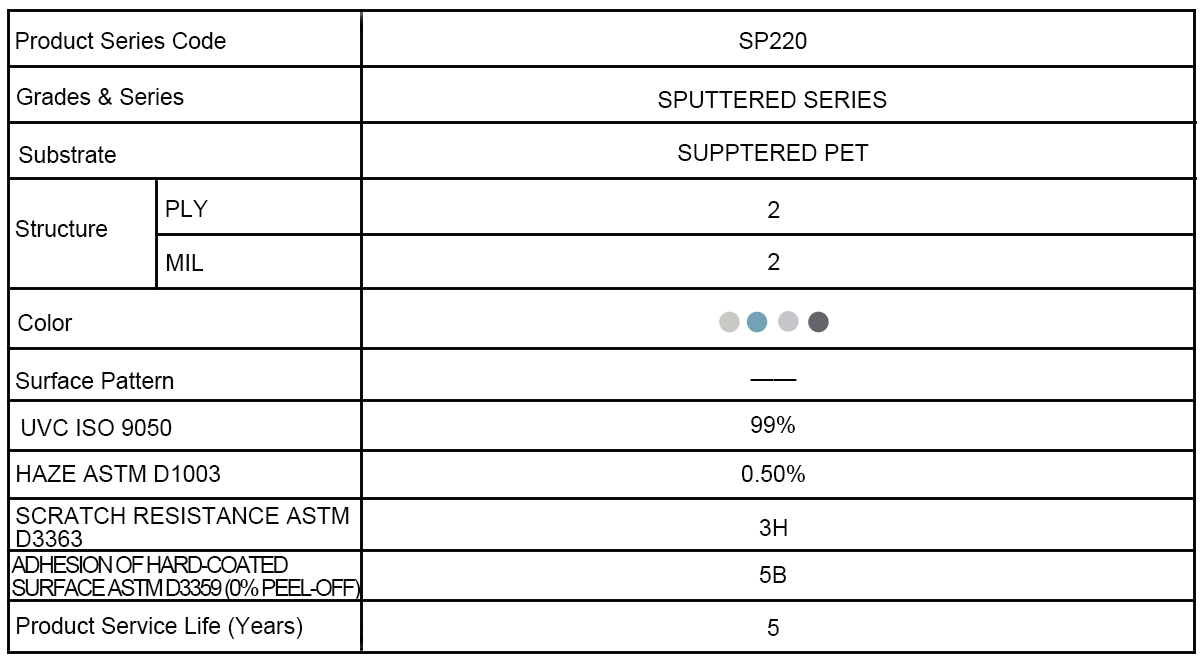 Aeon-CoolTM SP Series Sputtered Window film is a kind of 5-10 years durable film which is constructed by high vacuum magnetron sputtering technology to form a uniform, stable precious metal coating onto sheets of polyester. We can make final products to be 2 ply structures to achieve customers’ requirements. As no dye during the sputtered process, so films will not fade through the entirety of their lifetimes. Meanwhile, by using our lamination technologyto limit metal oxidation to ensure the films will last fa longer life than expected. With different color films, optical densities, and thickness choices, intended for long durable or high-end windows.