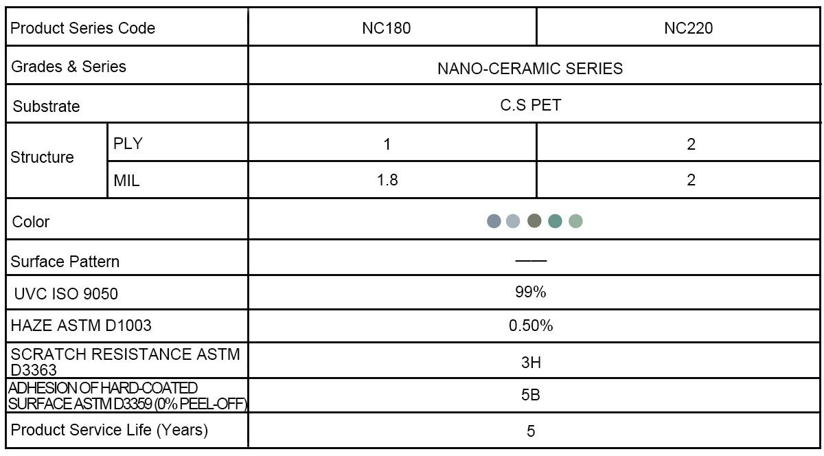 Aeon-CoolTM NC Series Nano ceramic Window film is a kind of 5-10 years durable film which is constructed by using solar spectrally selective absorbing Nano ceramic materials onto sheets of polyester. By using unique Nano materials in this process, we can make final products to be 2 ply structures products to achieve customers’ requirements. As NC series without metal elements, only using clear optical polyester, so without any interference by using electronicsdevices like GPS, radio etc. With different color films, optical densities, and thickness choices, intended for long durable or high-end windows.