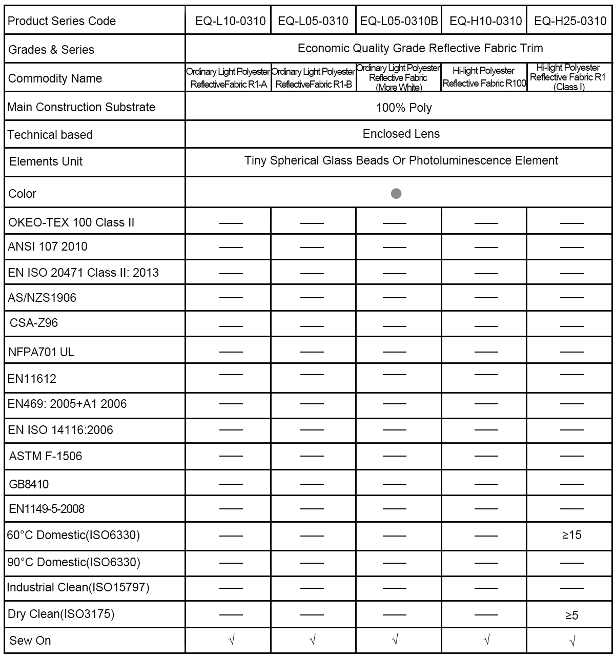 The Economic Quality grade EQ-0310 series reflective fabric has a poly backing and comes in rolls of 200 metersor 100 meters at a standard 50.8 mm width, other widths are available upon request, in a variety of fabrics can be sewn with padding or sewn on to fabrics, such as knit t-shirts, sweatshirts, outerwear for home wash applications.We supply the best qualified reflective fabric consistent performance at a competitive price as always.