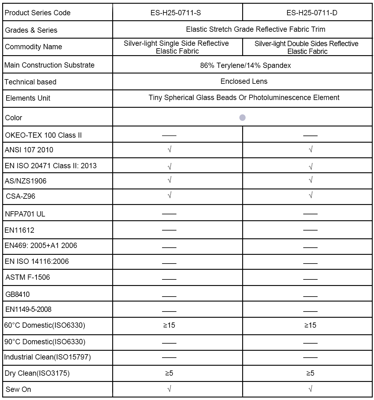 Aeon-VizTM Elastic Stretch Grade ES-H25-0711(-S, -D) series T/S reflective fabric Embedded semi-enclosed glass beads type reflective fabric trim designed for enhancing visibility in low light and nighttime conditions, bonded to a fabric substrate composed with wide-angle and high-refractive index retro-reflective lens of glass beads exposed structure, to improve the wearer is available at night or in adverse environments sight visibility plays a significant role.