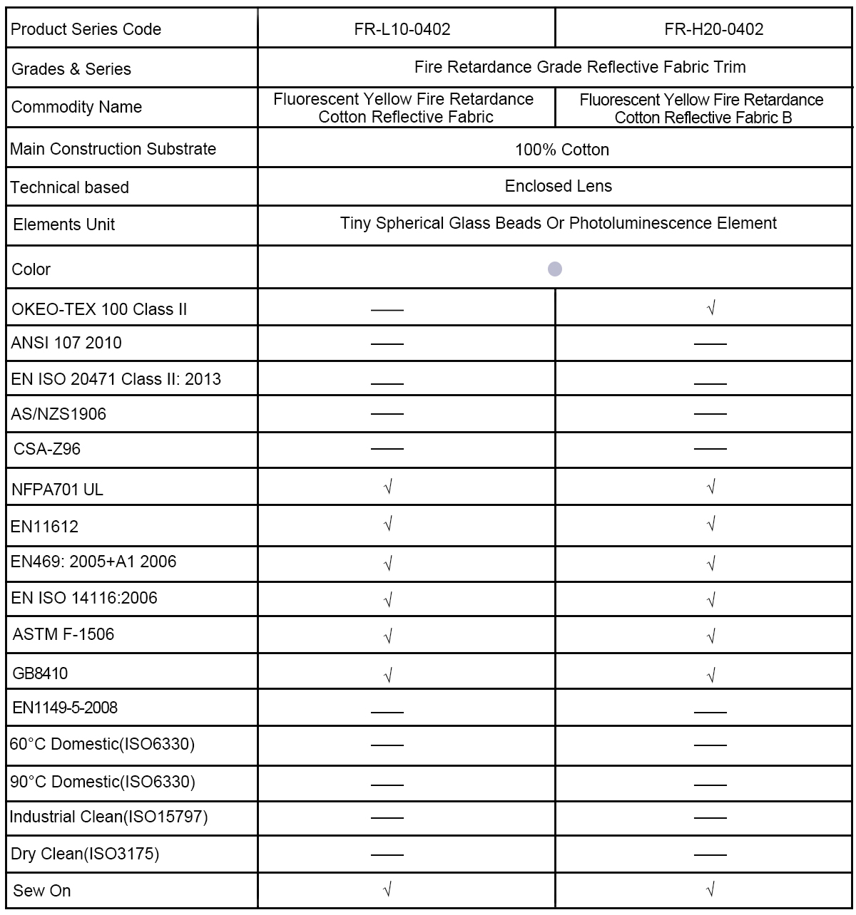 The Fire Retardance grade FR-L10-0402 series reflective fabric has a cotton backing and comes in rolls of 200 meters or 100 meters at a standard 50.8 mm width, other widths are available upon request, in a variety of fabrics can be sewn with padding or sewn on to fabrics, such as knit t-shirts, sweatshirts, outerwear for home wash applications. We supply the best qualified reflective fabric consistent performance at a competitive price as always.