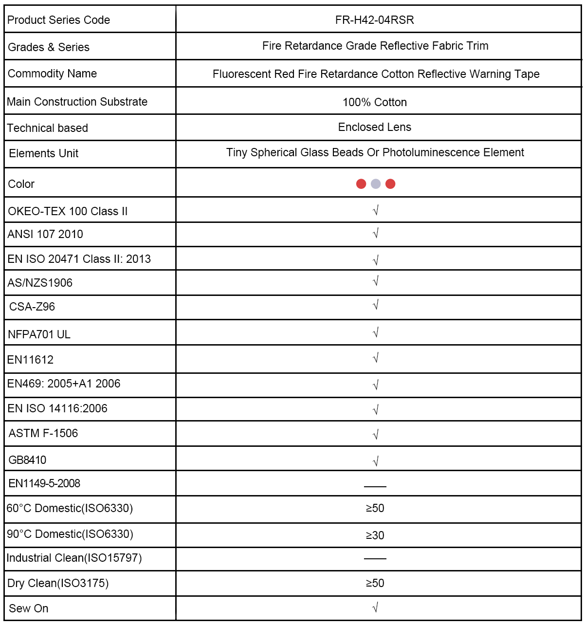 Aeon-VizTM Fire Retardance Grade FR-H42-04RSR series Embedded semi-enclosed glass beads type reflective warning trim designed for enhancing visibility in low light and nighttime conditions, bonded to a fabric substrate composed with wide-angle and high-refractive index retro-reflective lens of glass beads exposed structure, to improve the wearer is available at night or in adverse environments sight visibility plays a significant role.