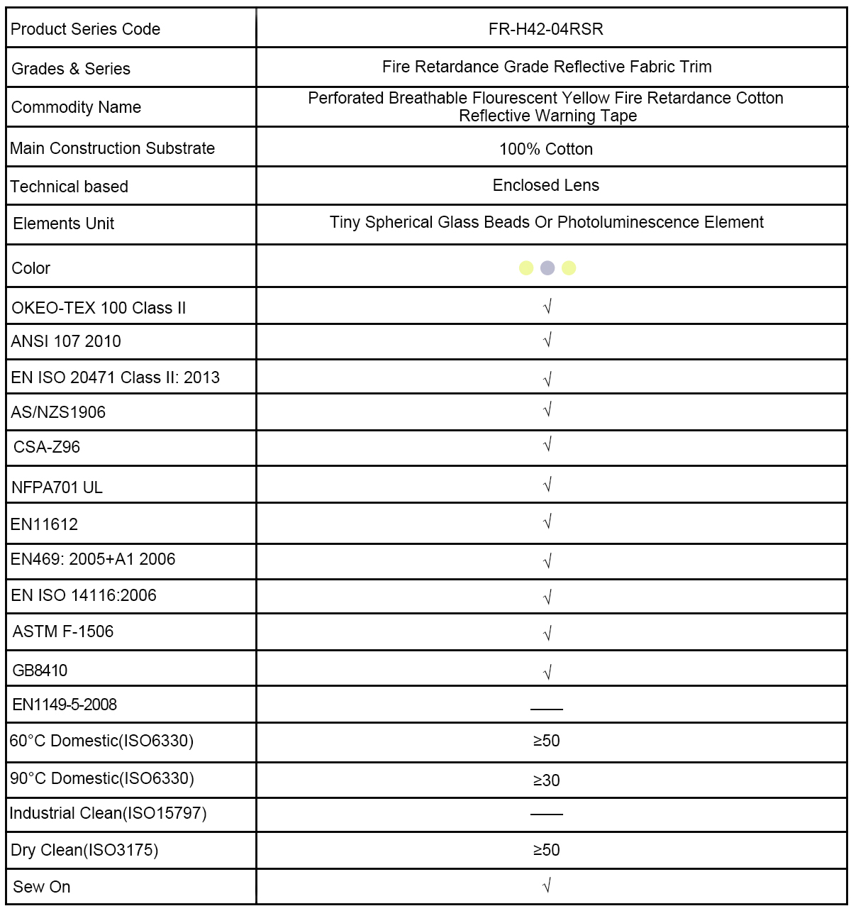Aeon-VizTM Fire Retardance Grade FR-H42-04YSY-PF series Embedded semi-enclosed glass beads type perforated reflective warning trim designed for enhancing visibility in low light and nighttime conditions, bonded to a fabric substrate composed with wide-angle and high-refractive index retro-reflective lens of glass beads exposed structure, to improve the wearer is available at night or in adverse environments sight visibility plays a significant role.