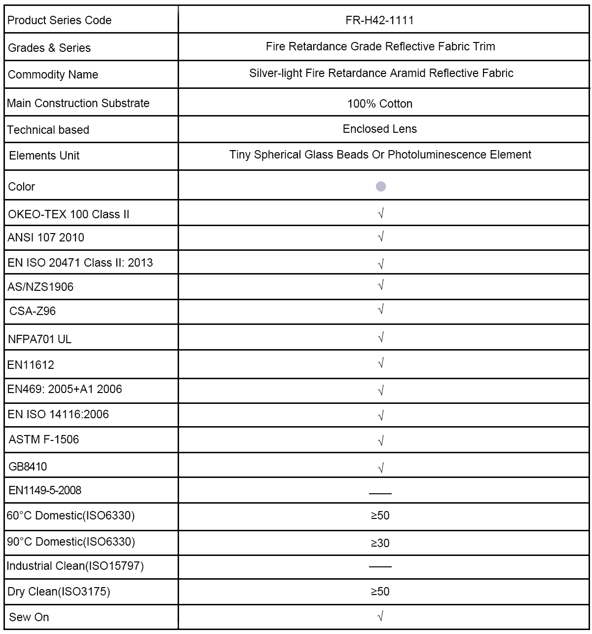 Aeon-VizTM Fire Retardance Grade FR-H42-1111 series Embedded semi-enclosed glass beads type reflective fabric trim designed for enhancing visibility in low light and nighttime conditions, bonded to a fabric substrate composed with wide-angle and high-refractive index retro-reflective lens of glass beads exposed structure, to improve the wearer is available at night or in adverse environments sight visibility plays a significant role.