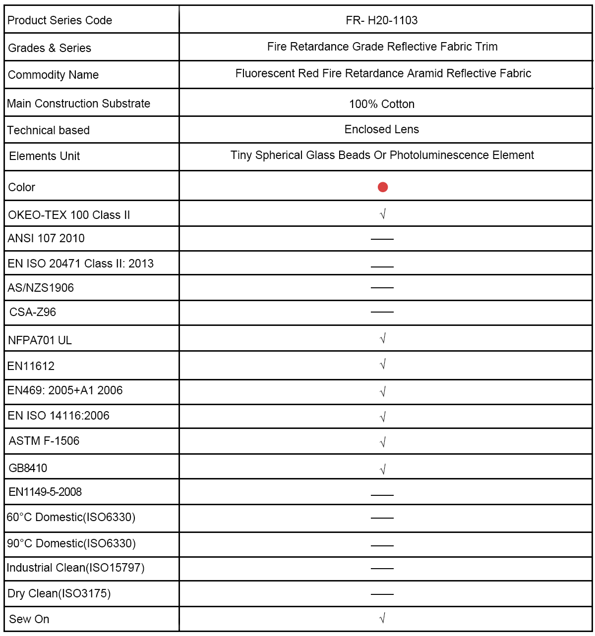 Aeon-VizTM Fire Retardance Grade FR-H20-1103 series Embedded semi-enclosed glass beads type reflective fabric trim designed for enhancing visibility in low light and nighttime conditions, bonded to a fabric substrate composed with wide-angle and high-refractive index retro-reflective lens of glass beads exposed structure, to improve the wearer is available at night or in adverse environments sight visibility plays a significant role.