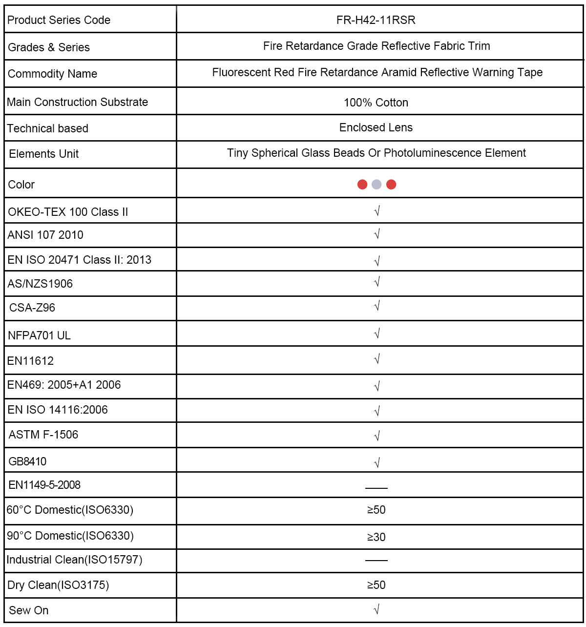Aeon-VizTM Fire Retardance Grade FR-H42-11RSR series Embedded semi-enclosed glass beads type reflective warning trim designed for enhancing visibility in low light and nighttime conditions, bonded to a fabric substrate composed with wide-angle and high-refractive index retro-reflective lens of glass beads exposed structure, to improve the wearer is available at night or in adverse environments sight visibility plays a significant role.