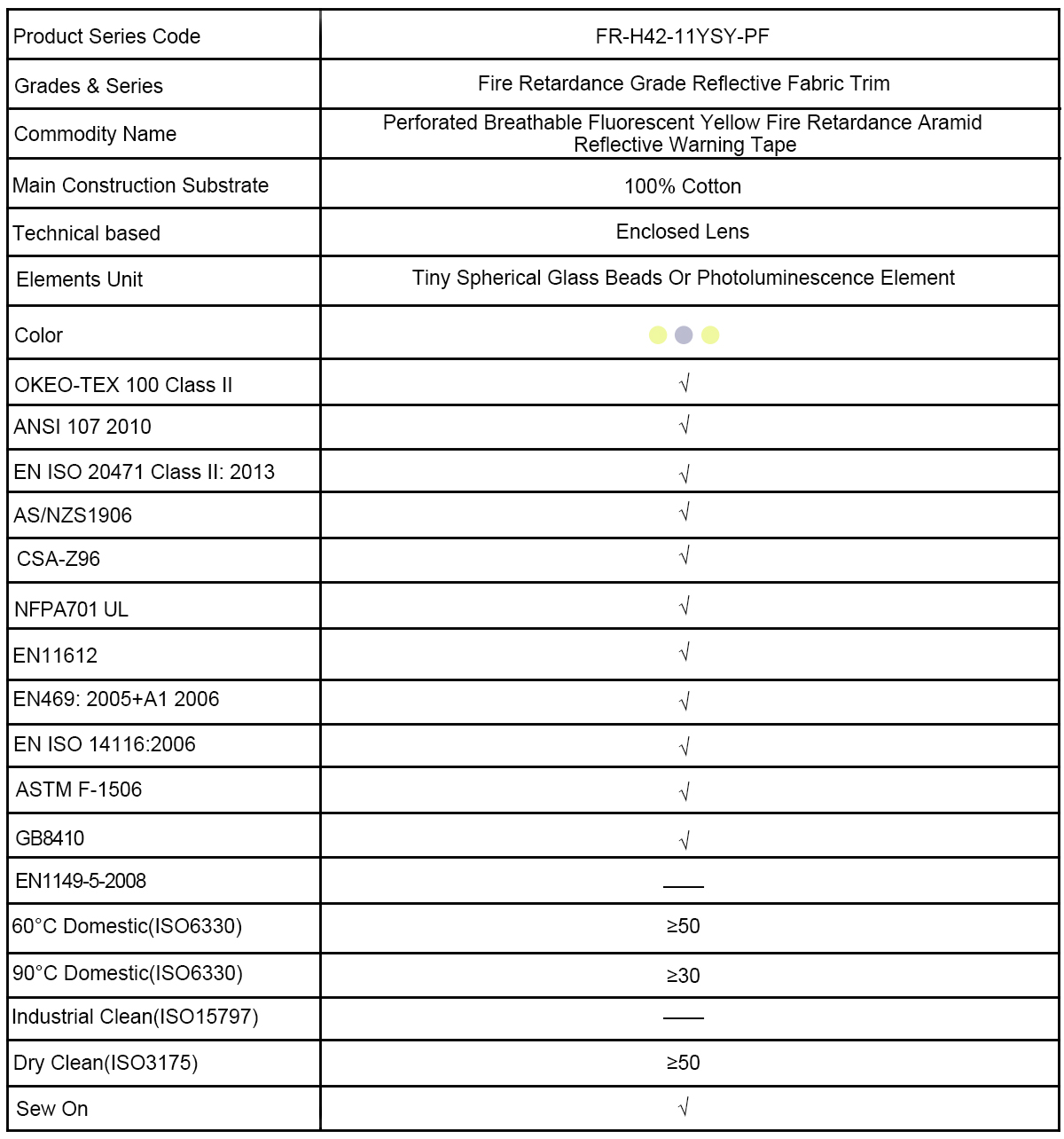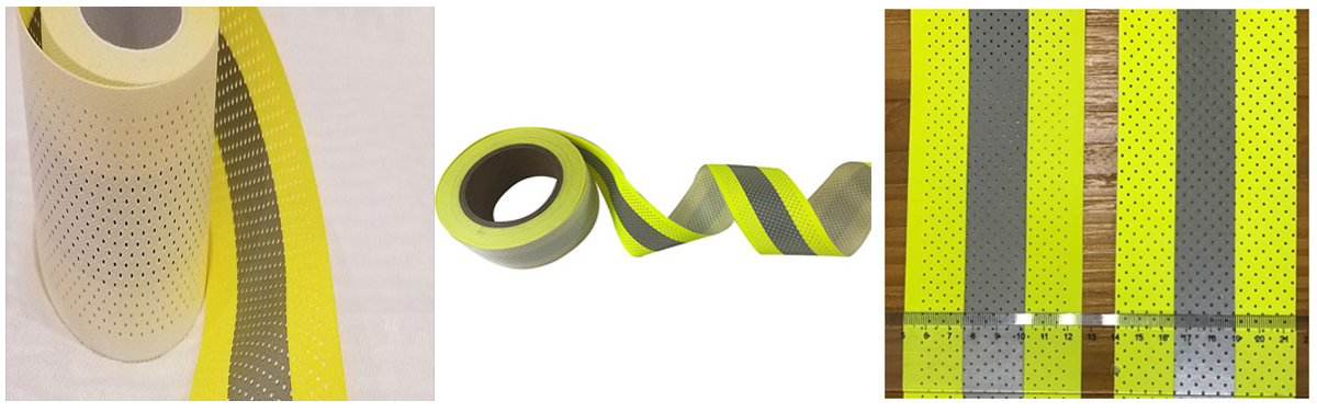 Aeon-VizTM Fire Retardance Grade FR-H42-11YSY-PF series Embedded semi-enclosed glass beads type perforated reflective fabric trim designed for enhancing visibility in low light and nighttime conditions, bonded to a fabric substrate composed with wide-angle and high-refractive index retro-reflective lens of glass beads exposed structure, to improve the wearer is available at night or in adverse environments sight visibility plays a significant role.