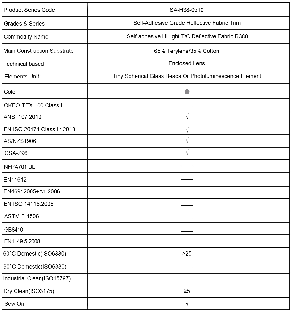 The Self-Adhesive grade SA-H38-0510 series reflective fabric has a polyester backing and comes in rolls of 200 meters or 100 meters at a standard 50.8 mm width, other widths are available upon request, in a variety of fabrics can be attached or sewn with padding or sewn on to fabrics, such as knit t-shirts, sweatshirts, outerwear for home wash applications. We supply the best qualified reflective fabric consistent performance at a competitive price as always.