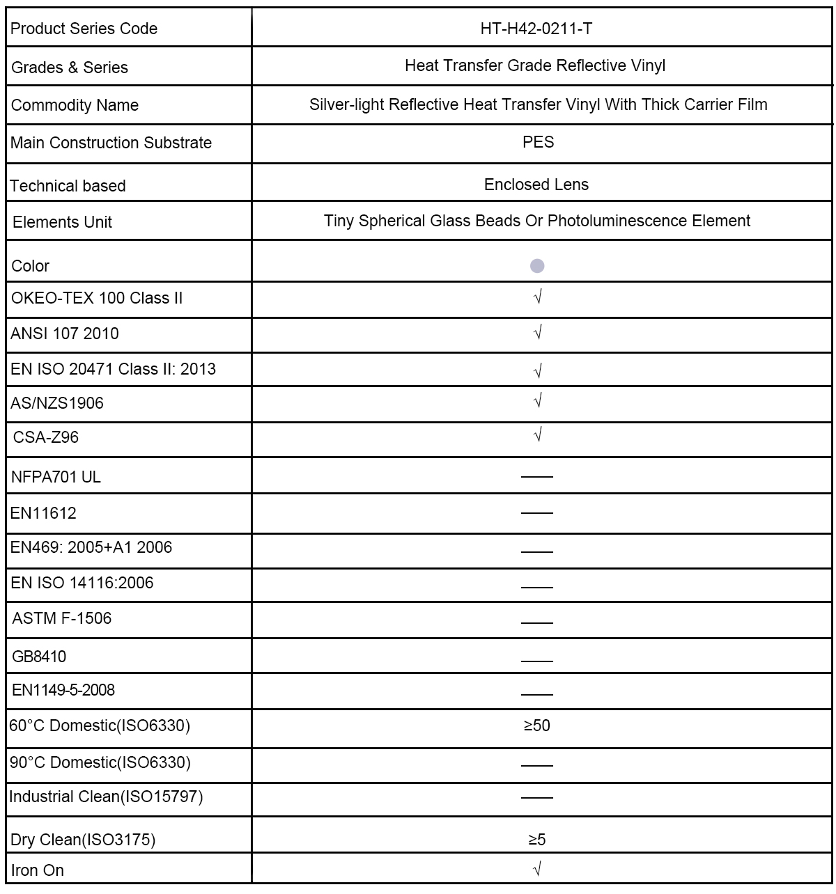 Aeon-VizTM Heat Transfer Grade HT-H42-0211-T series Embedded semi-enclosed glass beads type reflective heat transfer vinyl trim designed for enhancing visibility in low light and nighttime conditions, bonded to a PES substrate composed with wide-angle and high-refractive index retro-reflective lens of glass beads exposed structure, to improve the wearer is available at night or in adverse environments sight visibility plays a significant role.