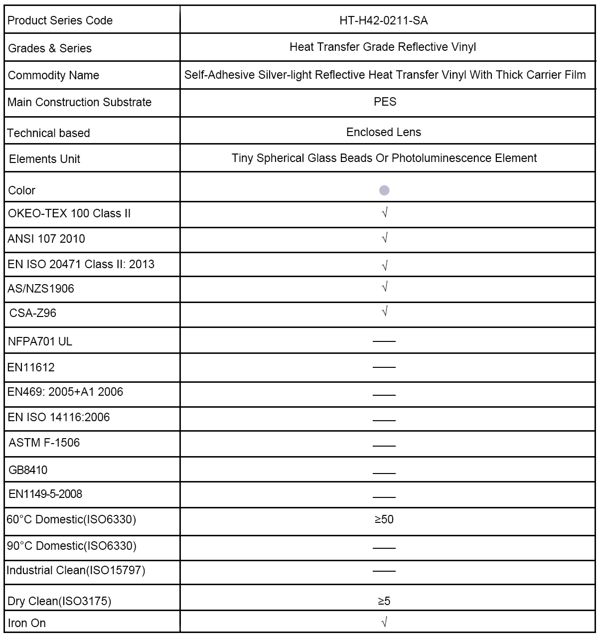 Aeon-VizTM Heat Transfer Grade HT-H42-0211-SA series Embedded semi-enclosed glass beads type reflective heat transfer vinyl trim designed for enhancing visibility in low light and nighttime conditions, bonded to a PES substrate composed with wide-angle and high-refractive index retro-reflective lens of glass beads exposed structure, to improve the wearer is available at night or in adverse environments sight visibility plays a significant role.