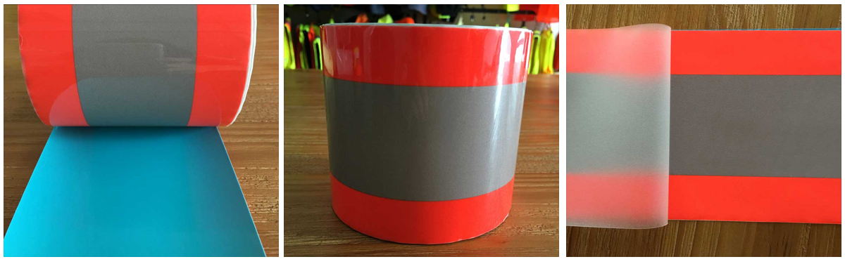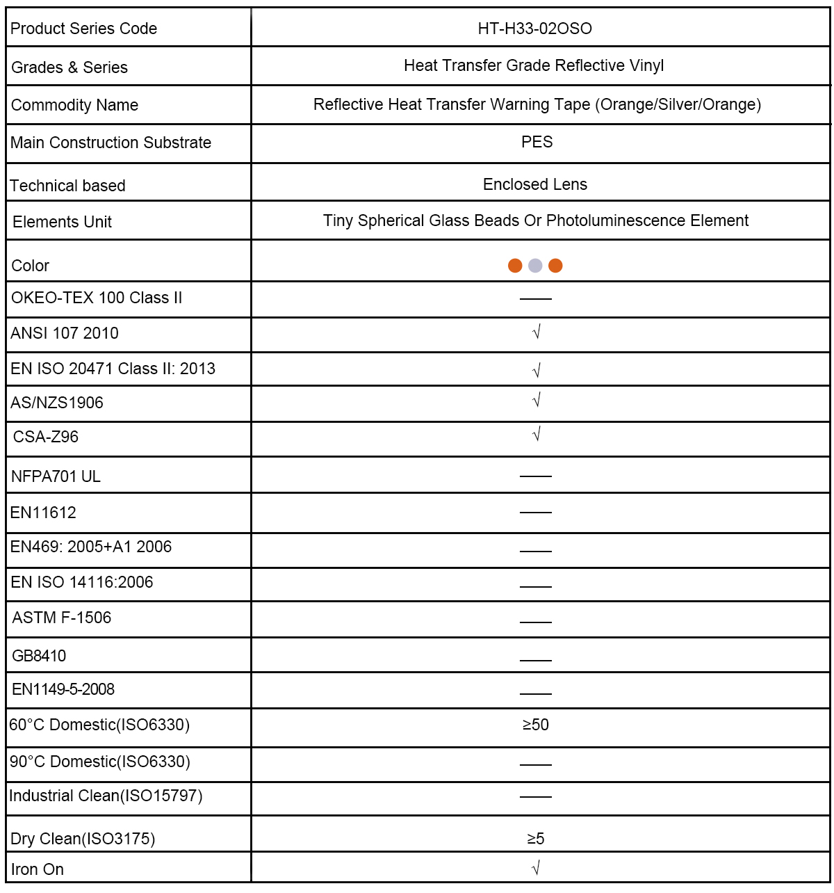 Aeon-VizTM Heat Transfer Grade HT-H33-02OSO series Embedded semi-enclosed glass beads type reflective heat transfer vinyl warning trim designed for enhancing visibility in low light and nighttime conditions, bonded to a PES substrate composed with wide-angle and high-refractive index retro-reflective lens of glass beads exposed structure, to improve the wearer is available at night or in adverse environments sight visibility plays a significant role.