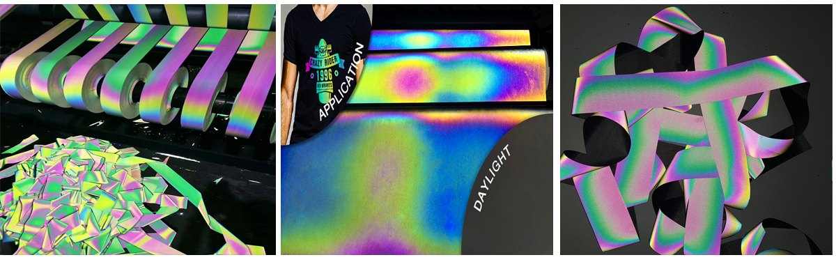 Aeon-VizTM Heat Transfer Grade HT-02ID series Embedded semi-enclosed glass beads type rainbow reflective heat transfer vinyl trim designed for enhancing visibility in low light and nighttime conditions, bonded to a PES substrate composed with wide-angle and high-refractive index retro-reflective lens of glass beads exposed structure, to improve the wearer is available at night or in adverse environments sight visibility plays a significant role.