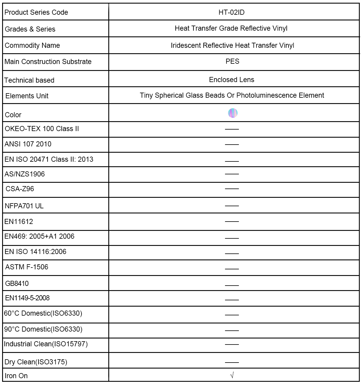 The heat transfer grade HT-02ID series iridescent colored reflective heat transfer vinyl has a hot melt adhesive PES substrate and PET carrier film and comes in rolls of 200 meters or 100 meters at a standard 50.8 mm width, other widths are available upon request, in a variety of fabrics can be attached or sewn with padding or sewn on to fabrics, such as knit t-shirts, sweatshirts, outerwear for home wash applications. It is suitable for using a computer or laser to carve a variety of fonts or patterns, and then heat them on all kinds of substrate. We supply the best qualified reflective heat transfer vinyl consistent performance at a competitive price as always.