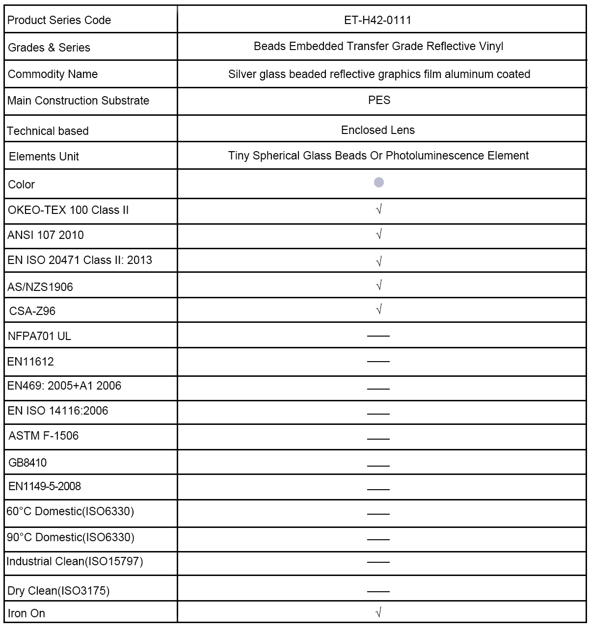 Aeon-VizTM Beads Embedded Grade ET-H42-0111 series Embedded semi-enclosed glass beads type aluminum coated reflective graphics vinyl designed for enhancing visibility in low light and nighttime conditions, bonded to a PES substrate composed with wide-angle and high-refractive index retro-reflective lens of glass beads exposed structure, to improve the wearer is available at night or in adverse environments sight visibility plays a significant role.