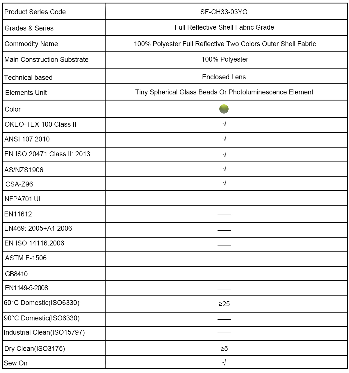 Aeon-VizTM Full Reflective Shell Fabric Grade SF-CH33-0300 series Embedded semi-enclosed glass beads type full reflective fabric designed for enhancing visibility in low light and nighttime conditions, bonded to a polyester substrate composed with wide-angle and high-refractive index retro-reflective lens of glass beads exposed structure, to improve the wearer is available at night or in adverse environments sight visibility plays a significant role.