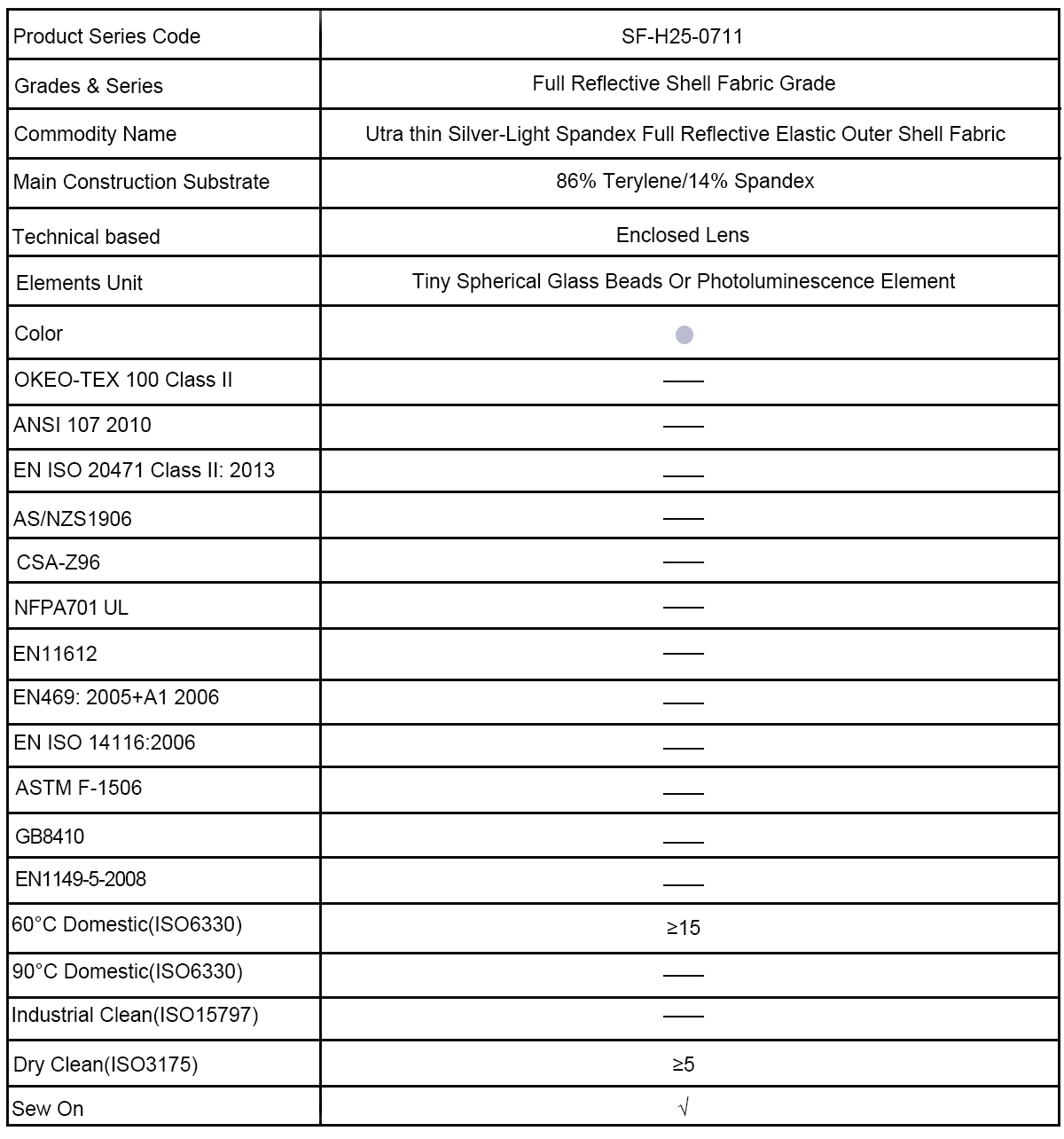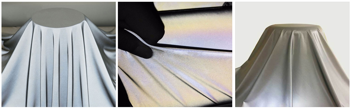 The full reflective shell fabric grade SF-H25-0711 series full reflective fabric has a 86% Terylene / 14% Spandex substrate and comes in rolls of 200 meters or 100 meters at a standard 50.8 mm width, other widths are available upon request, in a variety of fabrics can be attached or sewn with padding or sewn on to fabrics, such as knit tshirts, sweatshirts, outerwear for home wash applications. It is suitable for using a computer or laser to carve a variety of fonts or patterns, and then heat them on all kinds of substrate. We supply the best qualified reflective fabric consistent performance at a competitive price as always.