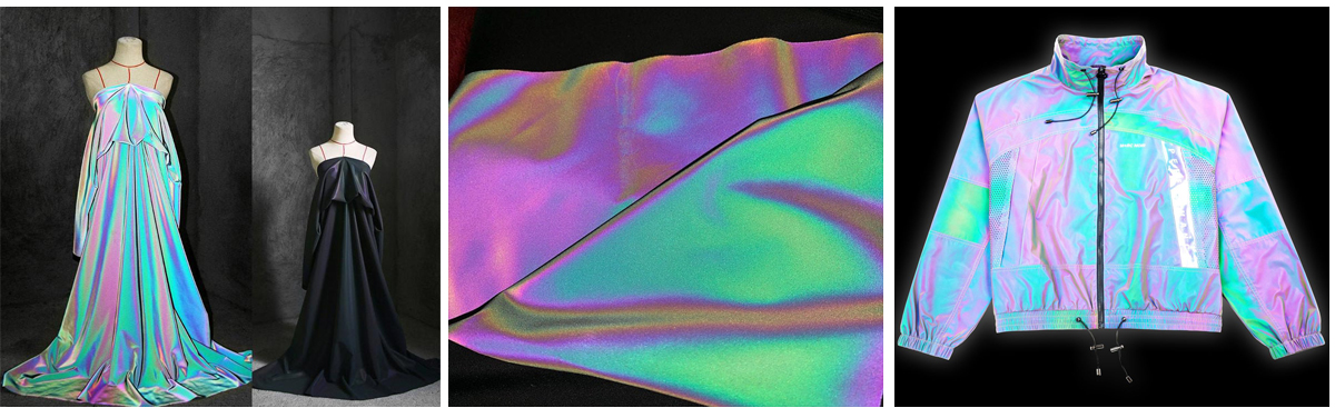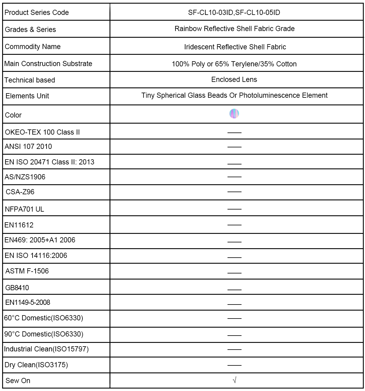 The rainbow reflective shell fabric grade SF-CL10-03ID (05ID) series full reflective fabric has a 100% Poly or 65% Terylene / 35% Cotton or 100% polyester substrate and comes in rolls of 200 meters or 100 meters at a standard 50.8 mm width, other widths are available upon request, in a variety of fabrics can be attached or sewn with padding or sewn on to fabrics, such as knit t-shirts, sweatshirts, outerwear for home wash applications. It is suitable for using a computer or laser to carve a variety of fonts or patterns, and then heat them on all kinds of substrate. We supply the best qualified reflective fabric consistent performance at a competitive price as always.