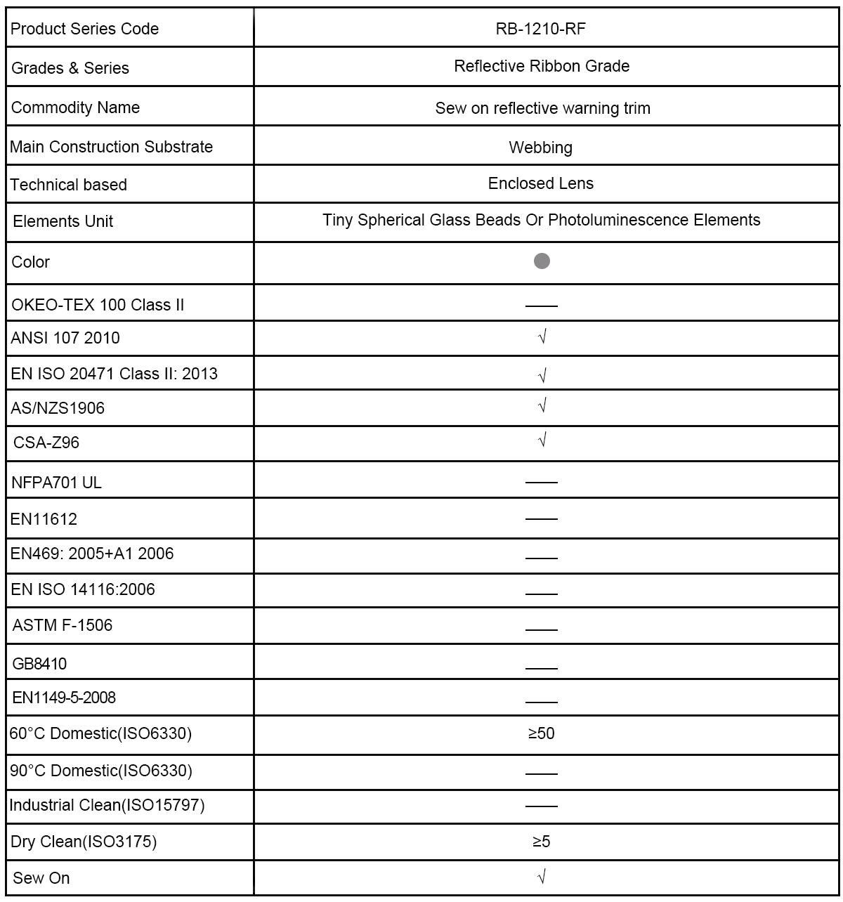 Aeon-VizTM Reflective Ribbon Grade RB-1210-RF series Embedded semi-enclosed glass beads type reflective ribbon trim designed for enhancing visibility in low light and nighttime conditions, bonded to a fabric substrate composed with wide-angle and high-refractive index retro-reflective lens of glass beads exposed structure, to improve the wearer is available at night or in adverse environments sight visibility plays a significant role.