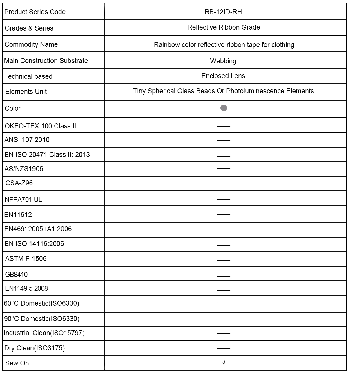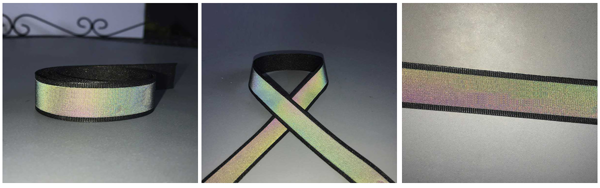 The reflective ribbon grade RB-12ID-RH series iridescent reflective ribbon trim has a webbing backing and comes in rolls of 200 meters or 100 meters at a standard 50.8 mm width, other widths are available upon request, in a variety of fabrics can be sewn with padding or sewn on to fabrics, such as knit t-shirts, sweatshirts, outerwear for home wash applications. We supply the best qualified reflective ribbon consistent performance at a competitive price as always.