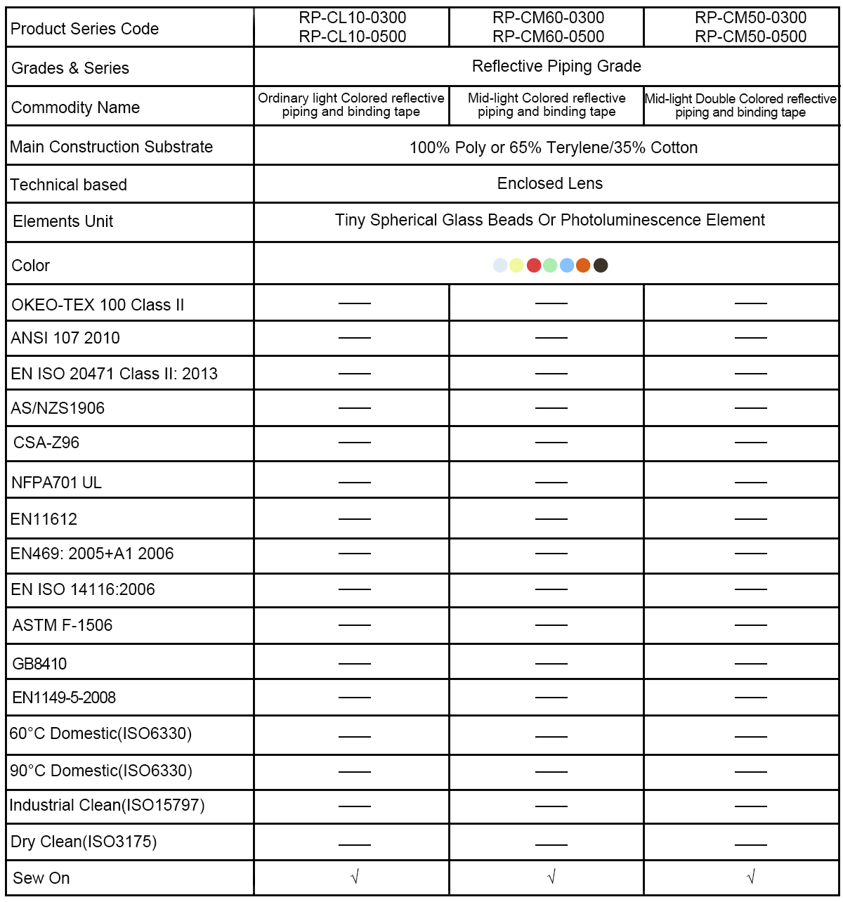 Aeon-VizTM Reflective Piping Grade RP-CL10(CM50, CM60)-0300(0500) series Embedded semi-enclosed glass beads type poly or T/C reflective piping or edging designed for enhancing visibility in low light and nighttime conditions, it is a highly reflective product and can match with different base materials. Extremely bright and durable, it is easily incorporated into a design and creates a point of difference. It is washable and gives a retroreflective effect, to improve the wearer is available at night or in adverse environments sight visibility plays a significant role.