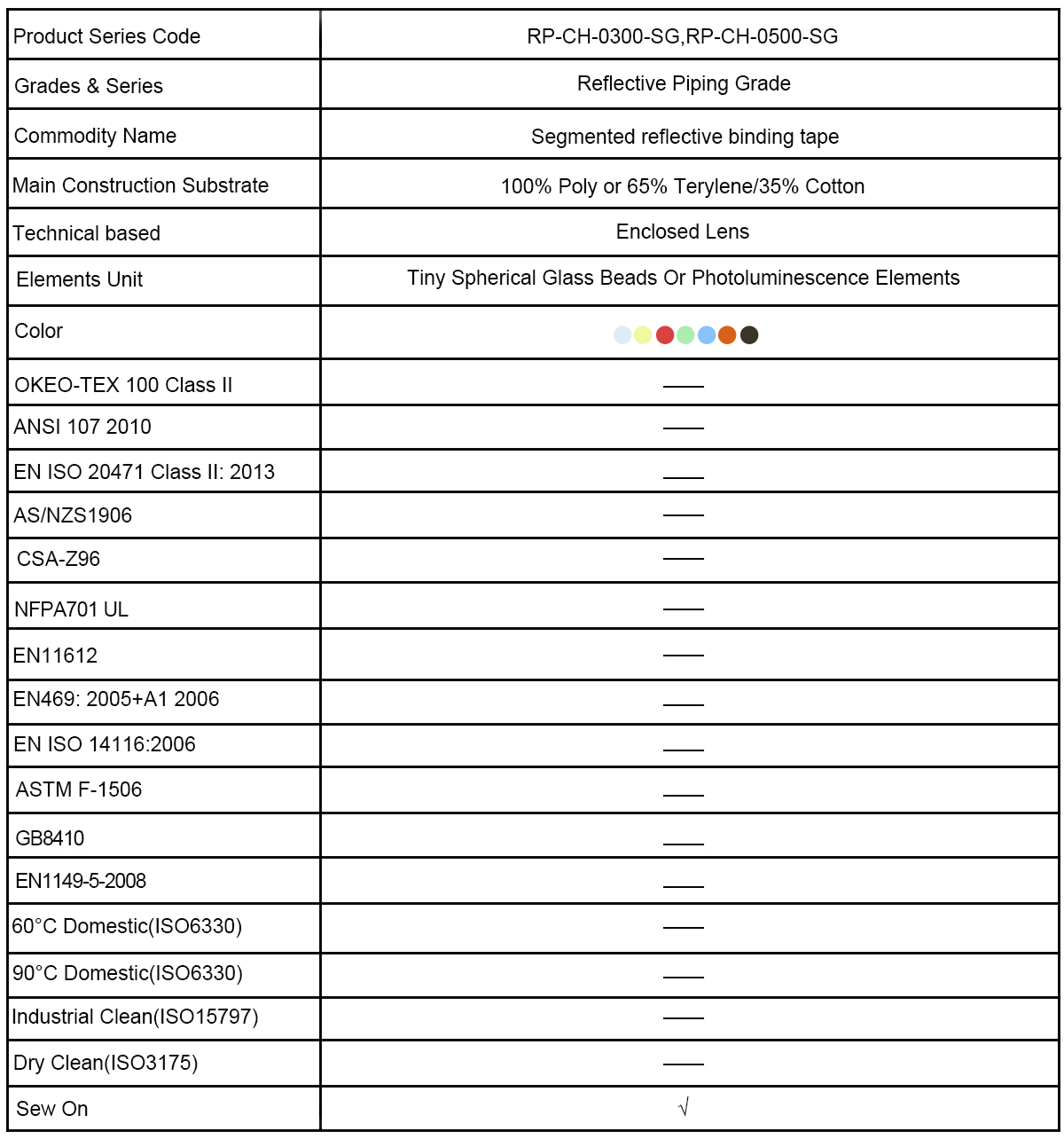 Aeon-VizTM Reflective Piping Grade RP-CH-0300-SG, RP-CH-0500-SG series Embedded semi-enclosed glass beads type poly or T/C segmented reflective piping or edging designed for enhancing visibility in low light and nighttime conditions, it is a highly reflective product and can match with different base materials. Extremely bright and durable, it is easily incorporated into a design and creates a point of difference. It is washable and gives a retro-reflective effect, to improve the wearer is available at night or in adverse environments sight visibility plays a significant role.