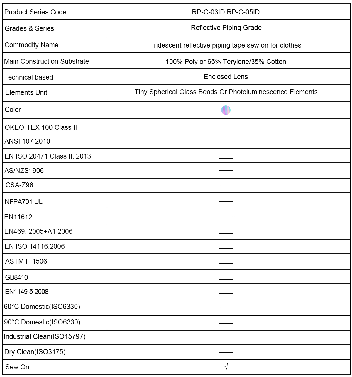 The reflective ribbon grade RP-C-03ID(05ID) series iridescent reflective piping or edging has a poly or T/C fabric backing and comes in rolls of 200 meters or 100 meters at a standard 1.3cm*1.7cm width, other widths are available upon request, in a variety of fabrics can be sewn with padding or sewn on to fabrics, extensively used in safety apparels, shoes, bags and gloves and others, these are available in a wide variety of specifications as per the exact requirements of clients. Moreover, these are quality checked on various stringent parameters to ensure their durability and quality. We supply the best qualified reflective piping consistent performance at a competitive price as always.